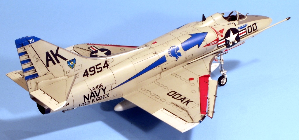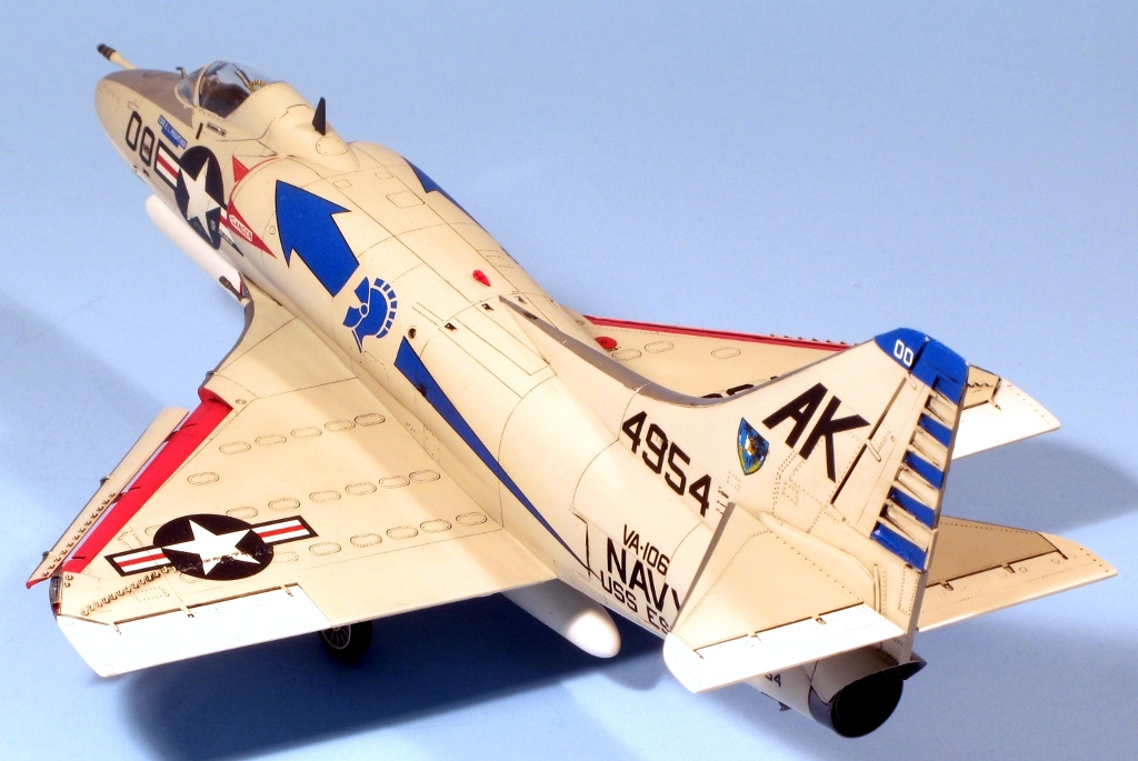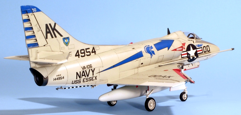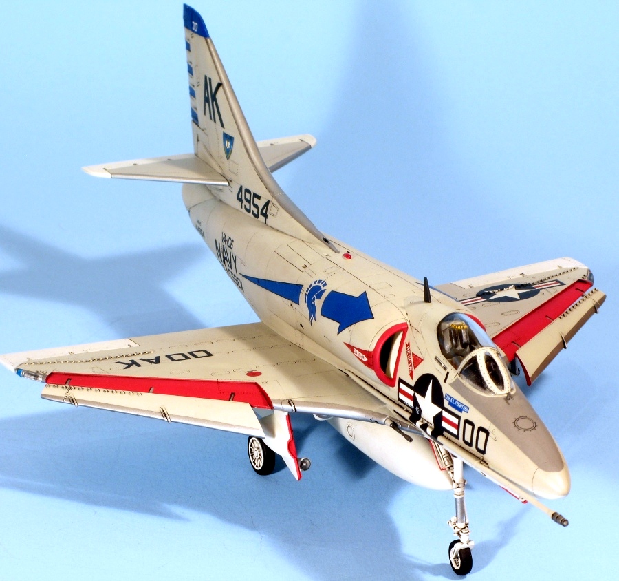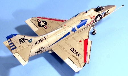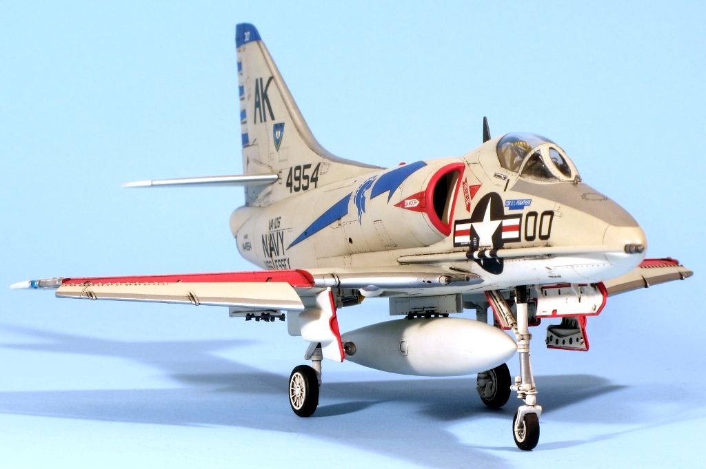 This, my third Hasegawa Skyhawk, was built simultaneously with an A-4K and an A-4M. As remarked with my A-4C and A-4F, this is a nice kit and Hasegawa has correctly back-dated it to the earlier A4D-2 (A-4B after 1962) by providing a new nose and instrument panel to the Charlie-model kit. They also tell you all the corrections necessary to make an accurate early Skyhawk by removing certain bits and pieces from the airframe. The kit went together okay, but it takes a while to remove the seams from the rear lower fuselage inserts, forward wingroot inserts and the insert at the base of the fin. Fit of the transparencies and the wing-to-fuselage is exemplary, and the new nose fits well also. The tailplanes are a push fit and can be added at the end of construction, as can the tailpipe. I used Humbrol enamels to paint the aircraft with Alclad II Aluminium for the leading edges of the wings, tail and pylons. I suspect I have made a mistake by following the instructions and painting the landing gear door edges red — most pictures of early Skyhawks seem to show that the door edges were white. I went for the second of the kit decal options with the stunning fuselage markings in that lovely shade of blue. They went down well with a combination of Micro Sol,Daco Products Stong Setting Solution and Mr Hobby Mr Mark Softer. The tricky bit is getting the upper national insignia to go over the vortex generators, and I’ve not found a satisfactory solution to this problem on any of my four US Skyhawks.
