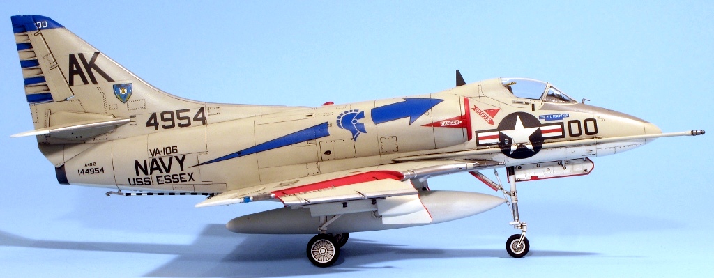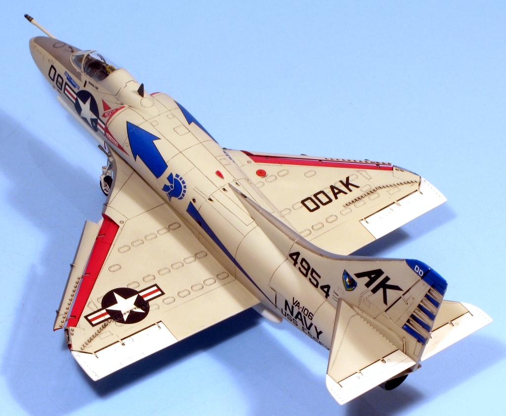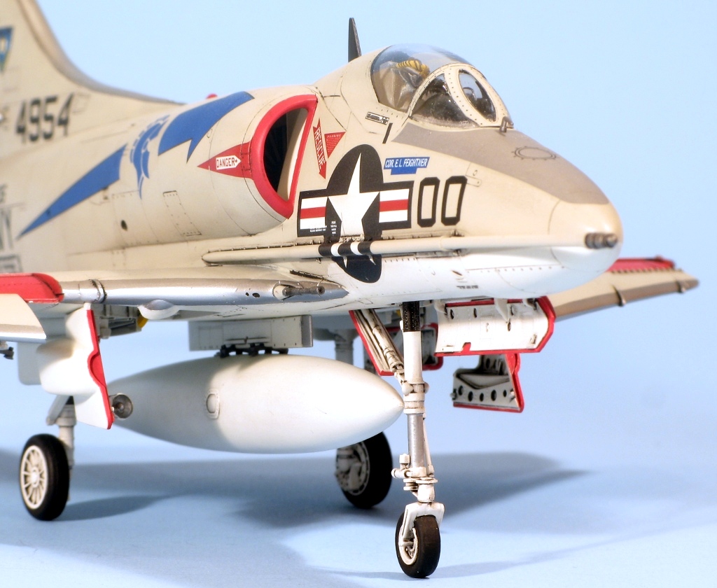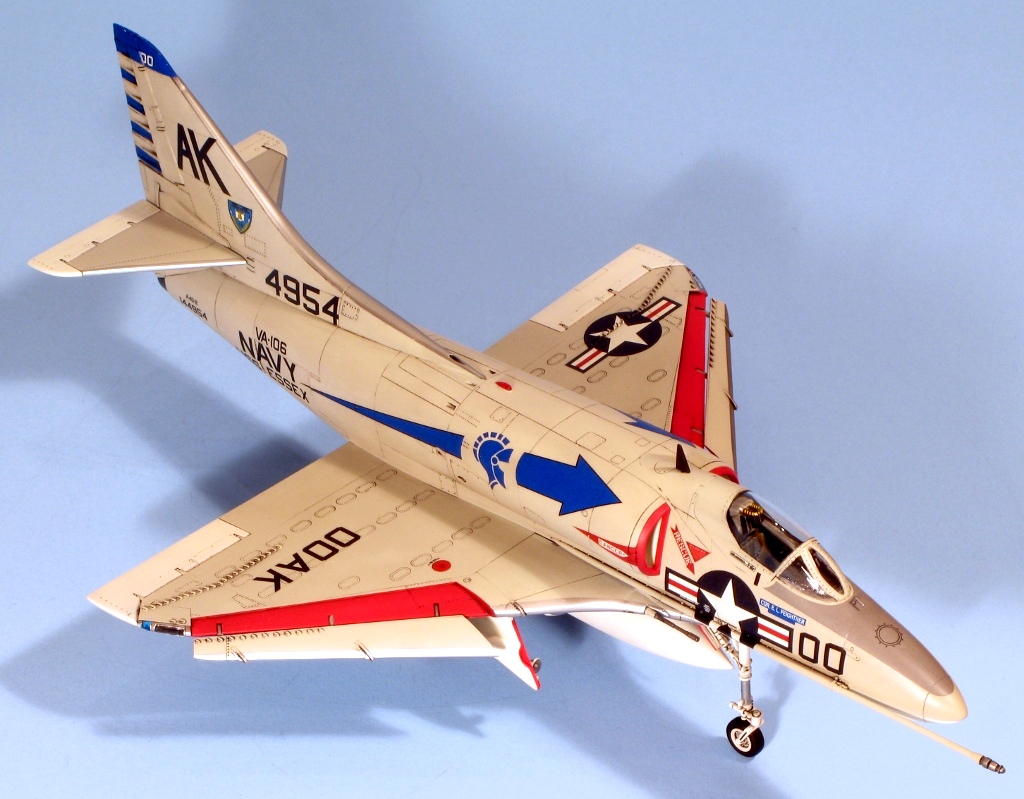 This, my third Hasegawa Skyhawk, was built simultaneously with an A-4K and an A-4M. As remarked with my A-4C and A-4F, this is a nice kit and Hasegawa has correctly back-dated it to the earlier A4D-2 (A-4B after 1962) by providing a new nose and instrument panel to the Charlie-model kit. They also tell you all the corrections necessary to make an accurate early Skyhawk by removing certain bits and pieces from the airframe. The kit went together okay, but it takes a while to remove the seams from the rear lower fuselage inserts, forward wingroot inserts and the insert at the base of the fin. Fit of the transparencies and the wing-to-fuselage is exemplary, and the new nose fits well also. The tailplanes are a push fit and can be added at the end of construction, as can the tailpipe. I used Humbrol enamels to paint the aircraft with Alclad II Aluminium for the leading edges of the wings, tail and pylons. I suspect I have made a mistake by following the instructions and painting the landing gear door edges red — most pictures of early Skyhawks seem to show that the door edges were white. I went for the second of the kit decal options with the stunning fuselage markings in that lovely shade of blue. They went down well with a combination of Micro Sol,Daco Products Stong Setting Solution and Mr Hobby Mr Mark Softer. The tricky bit is getting the upper national insignia to go over the vortex generators, and I’ve not found a satisfactory solution to this problem on any of my four US Skyhawks.