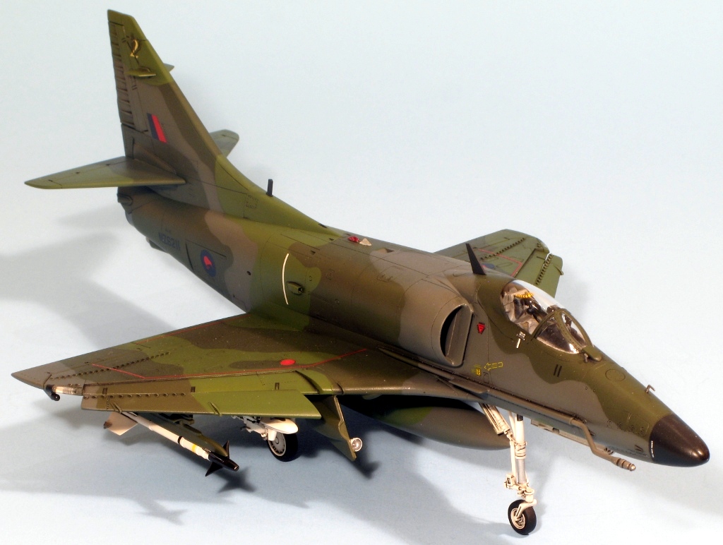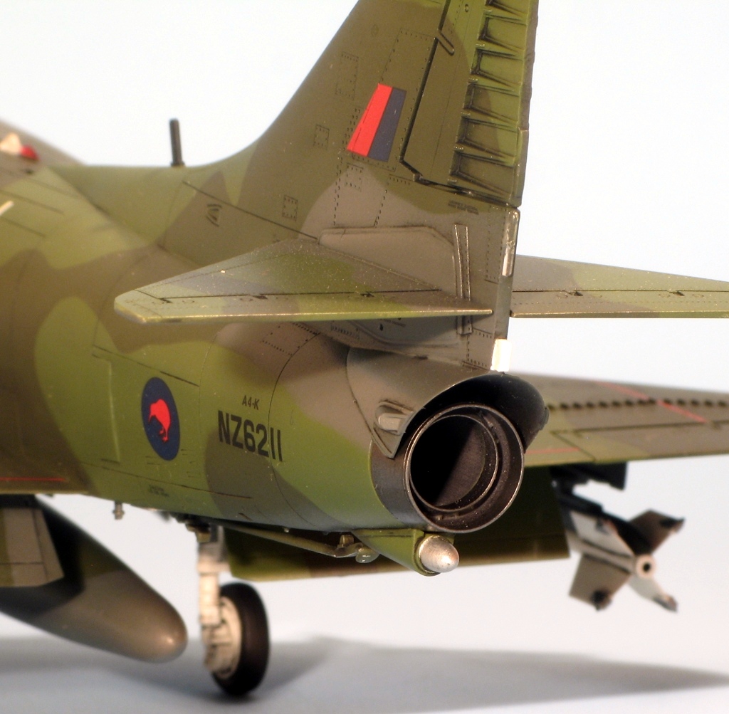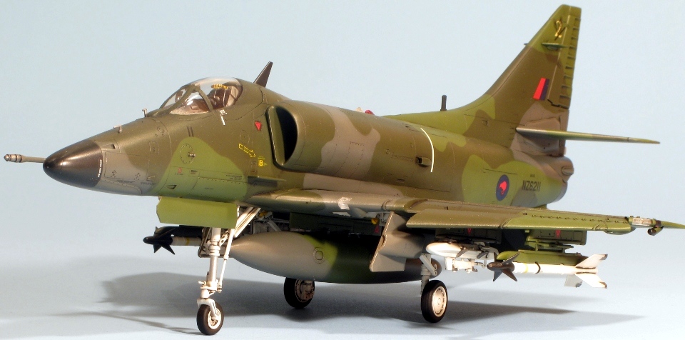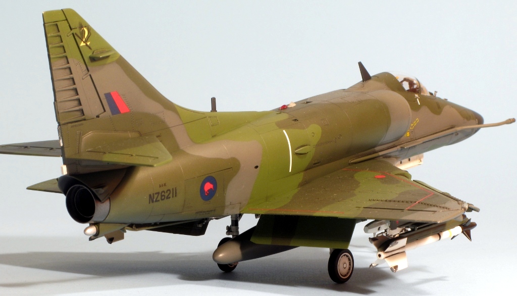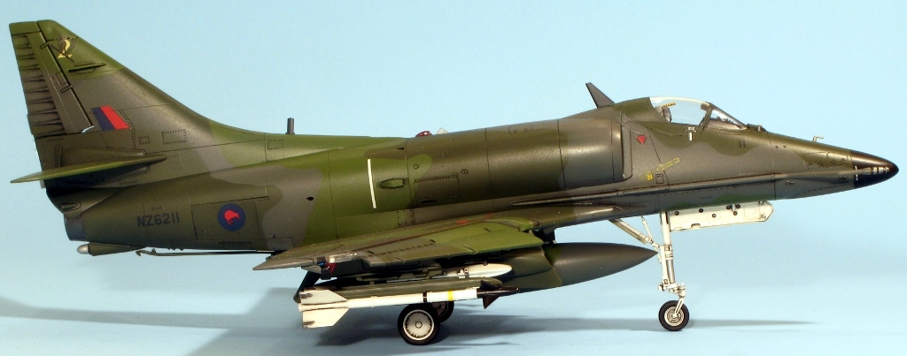 Built at the same time as my A4D-2 and A-4M Skyhawks is this New Zealand A-4K from Hasegawa. The same comments on construction apply, the fit of this example being slightly better because the fuselage, from the A-4E/F kit, doesn’t have a separate nose. Hasegawa supply the necessary parts for the Kahu upgrade in white metal, these being the underwing RWR sensors near the wing tips, the small horizontal aerials on the tail fin and the clear light on the fuselage. I replaced the latter with a piece of clear plastic hacked from a spare HUD. The seat was replaced by a Cutting Edge example, which was a waste of money (the seat is good, but you can barely see it through the tiny canopy!). The instrument panel is incorrect for a Kahu Skyhawk, but as it cannot be seen at all, I didn’t bother replacing it. There are meant to be 6 Mk 82 bombs under the wings but I hadn’t got round to attaching them when the pictures were taken. The kit supplies decals for a pre-Kahu upgrade A-4K, and one for a Kahu example. I used the latter as I like my Skyhawks to be as different as possible and wanted to use the white metal parts. The paint is mostly Humbrol but I used Xtracolour for the European One grey. The kit decals went down without silvering using first Microsol followed by Daco Products Strong Setting Solution and then Mr Hobby Mr Mark Softer on the stubborn decals. The final finish is a mixture of Pollyscale Satin and Flat varnishes.
