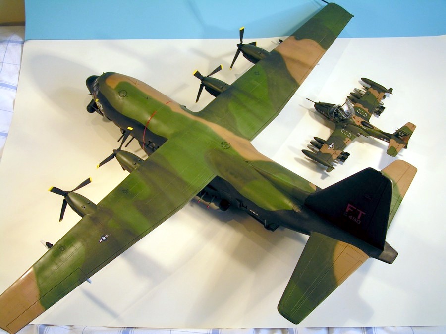 This is the BIG one. The SR-71A and TR-1A/TR-1B were pretty big, but this model is bigger: the Italeri AC-130A Spectre gunship. Really, this kit goes beyond the limits of what can be done with injection moulded plastic kits. It goes together fine, although I constructed the fuselage into two longitudinally split halves, rather than following the instructions and building separate front and rear fuselage sections, and the only poor areas are the engine joints. The kit has raised detailing, and I rescribed the wings — this was my first rescribing effort and I used an Olfa P-cutter. The finish is acrylic I think, and the decals were from the kit. This was a hard kit to finish: it’s so big that I lost motivation. I accidentally stood on the front windscreen, hence that looks rubbish, and snapped the nosegear leg, which needs to be attached early on in the build sequence. The overall finish is pretty poor as I only used Klear in patches and didn’t overcoat with a matt or satin varnish. Since finishing the model the fuselage seam has cracked open due to the weight of the wings, despite a spar being provided with the kit. I probably wouldn’t attempt to build a kit like this again — it’s just too big and flimsy.