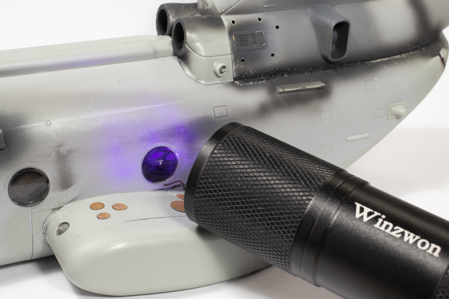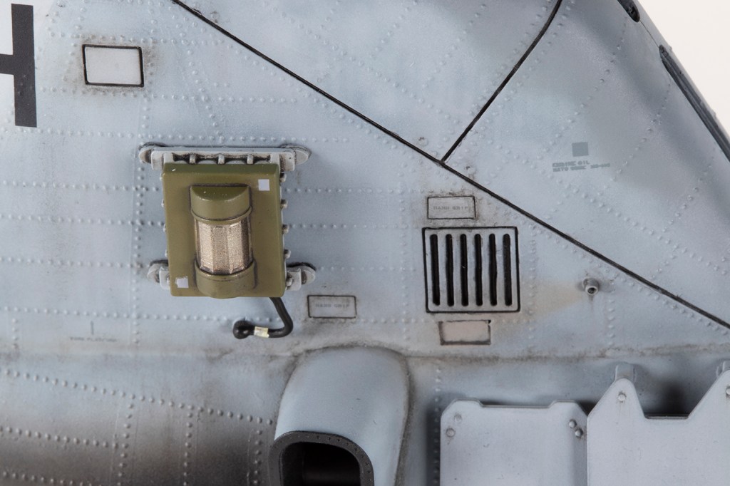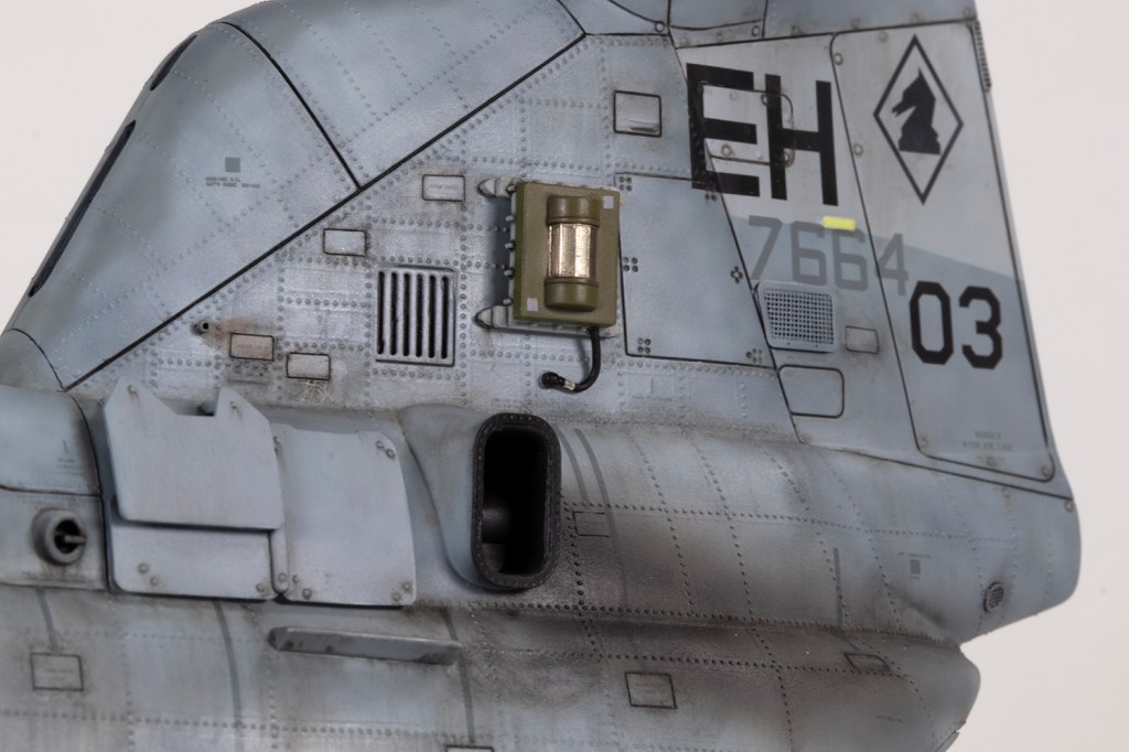 Numerous details still needed to be attended to: the navigation lights were smashed from heated clear sprue pushed through an Eduard PE template, Academy didn’t provide the blade aerials for under the fuselage so mine are from the spares box, as was the landing light at the front and the tail light at the rear. The ECM boxes on either side of the tail were missing their wiring and attachment points, the former made from lead wire and the latter from scrap sprue.