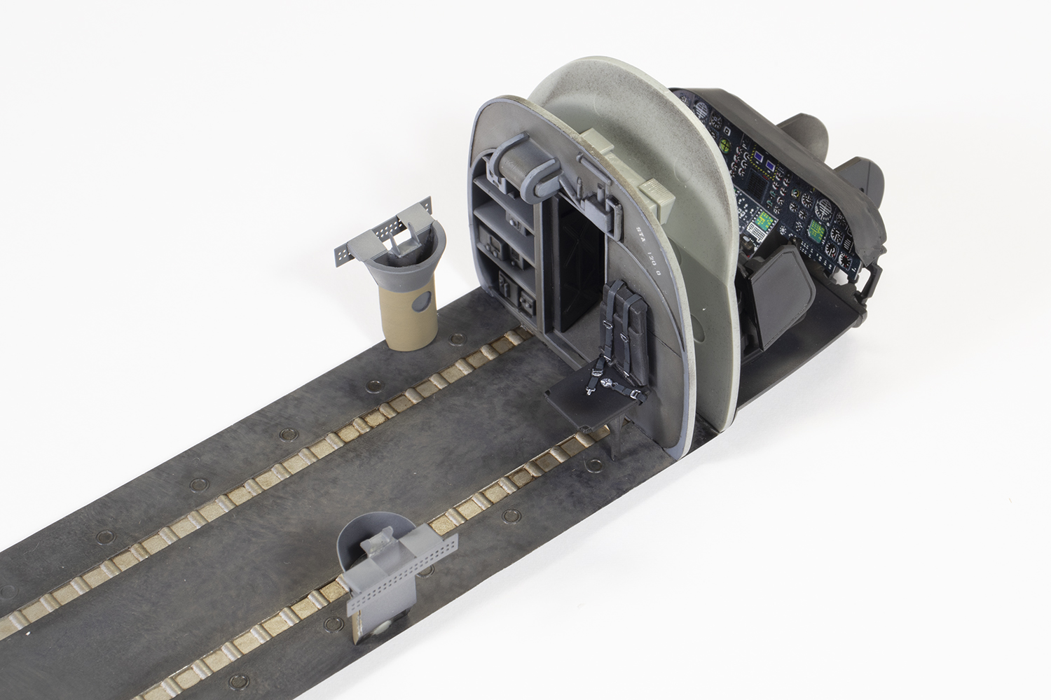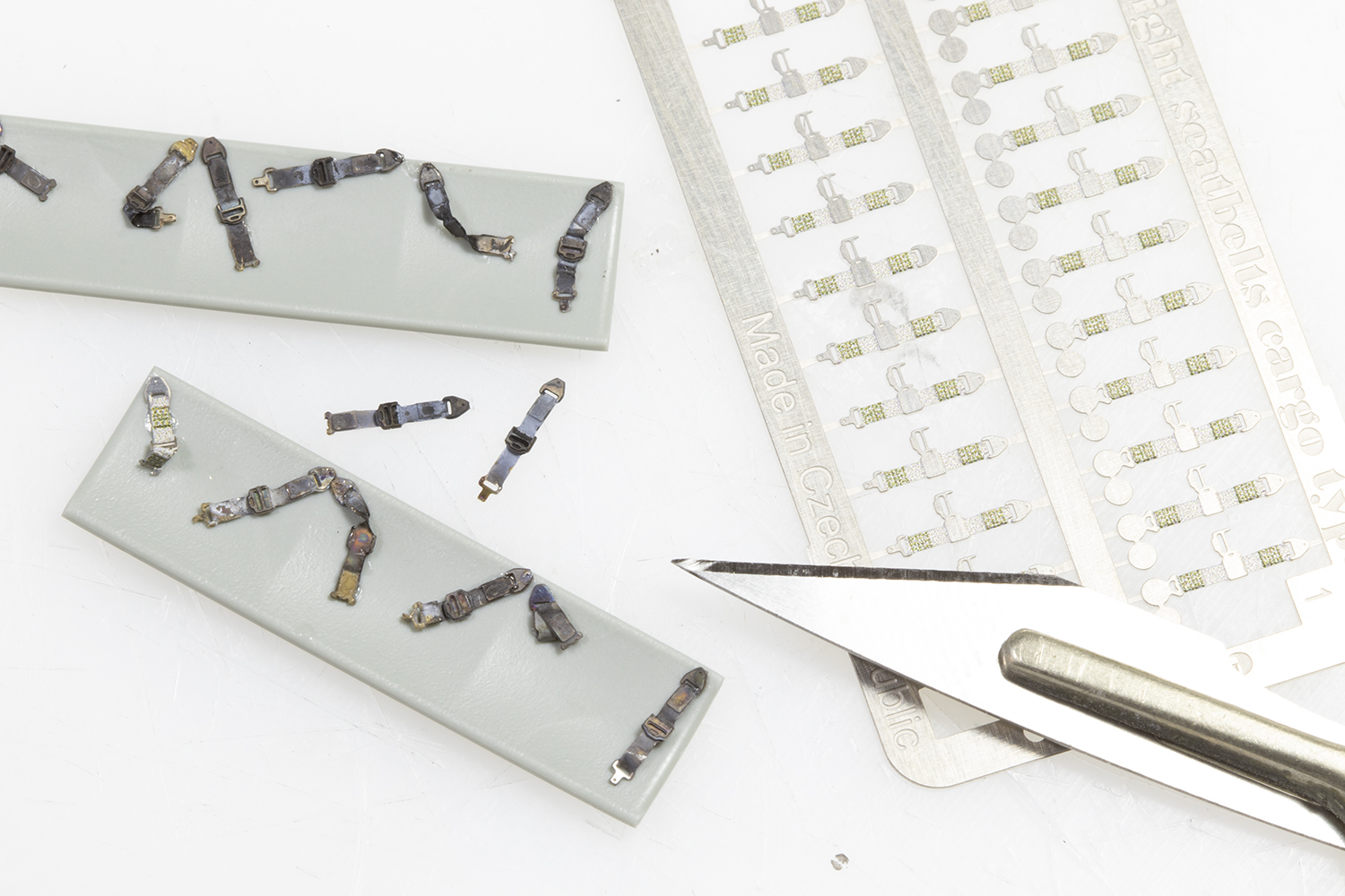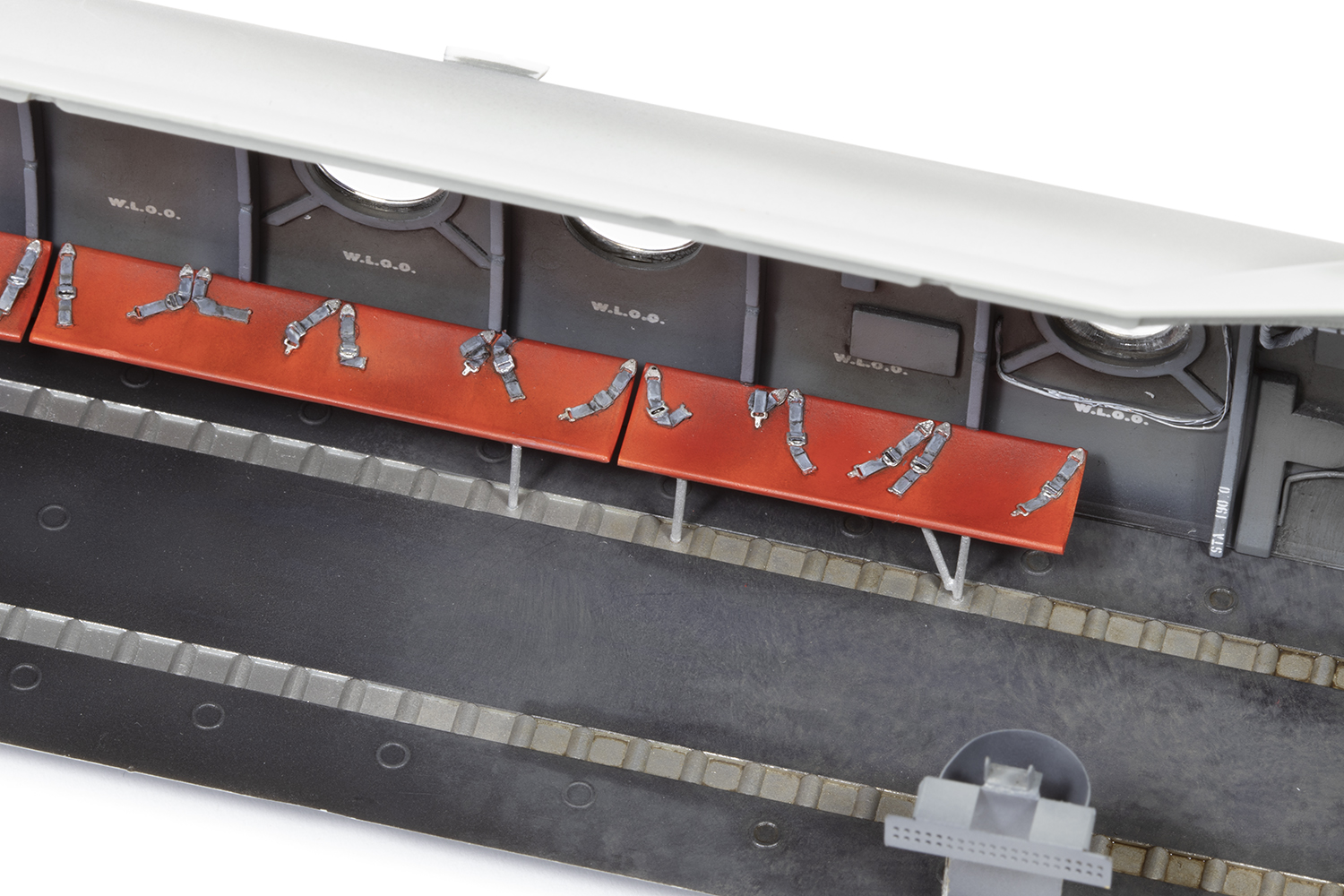 The seats, on the other hand, remained exposed, and a happy few hours were spent adding all the etched belts. The red canvas adds a nice splash of colour, and I could ignore most of the seat legs as, again, they could not be seen. Those that could were replaced by thinner plastic rod. A missing jump seat behind the cockpit was added using a UH-60 part.