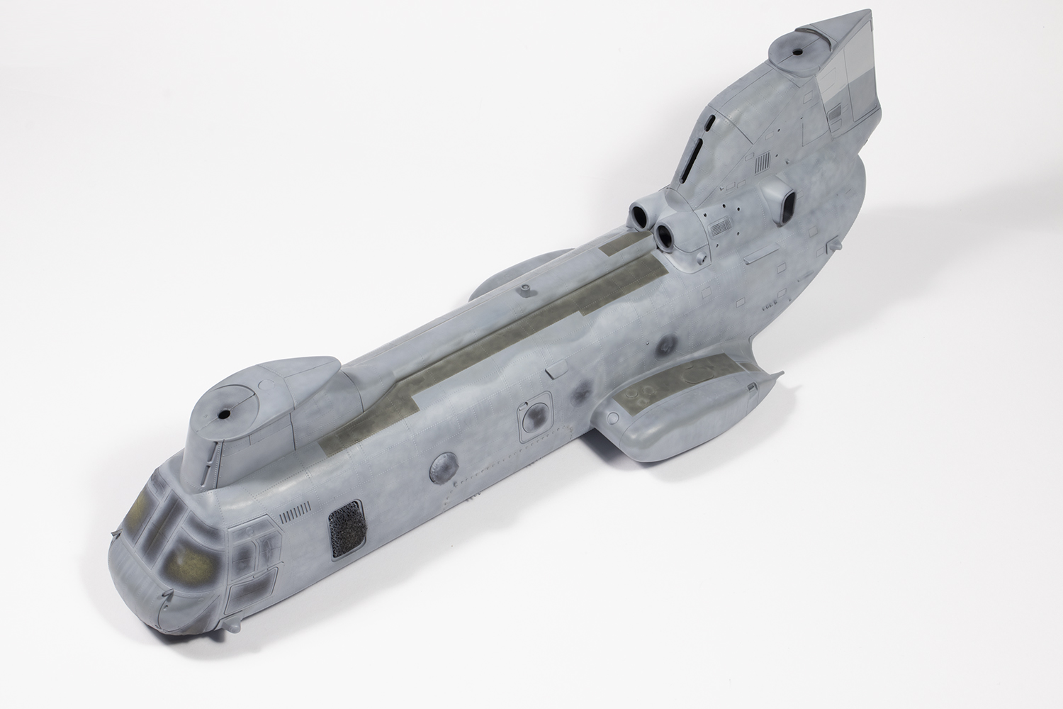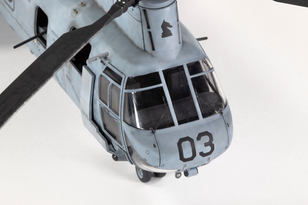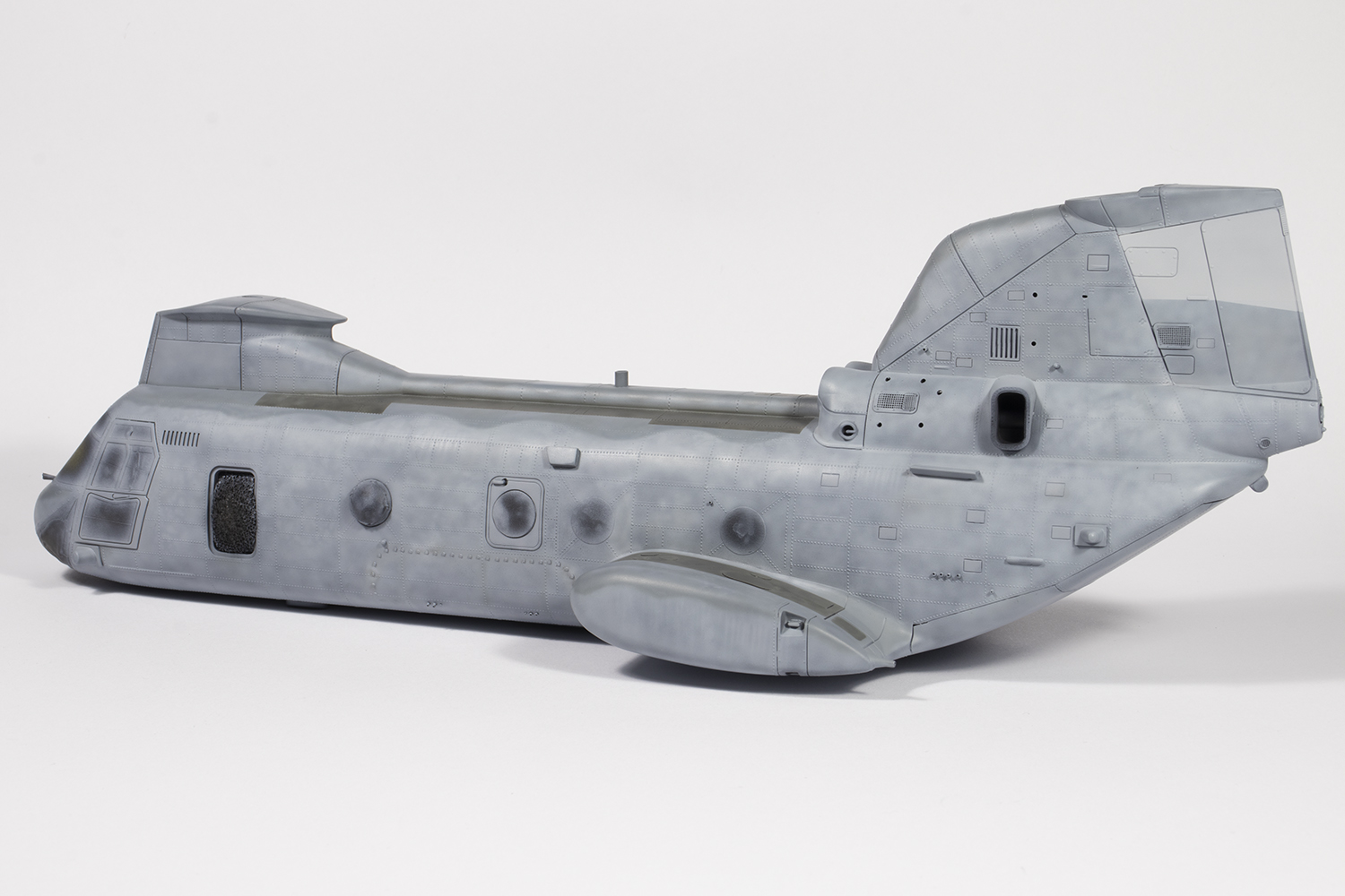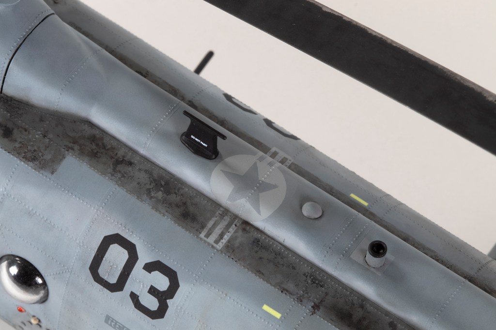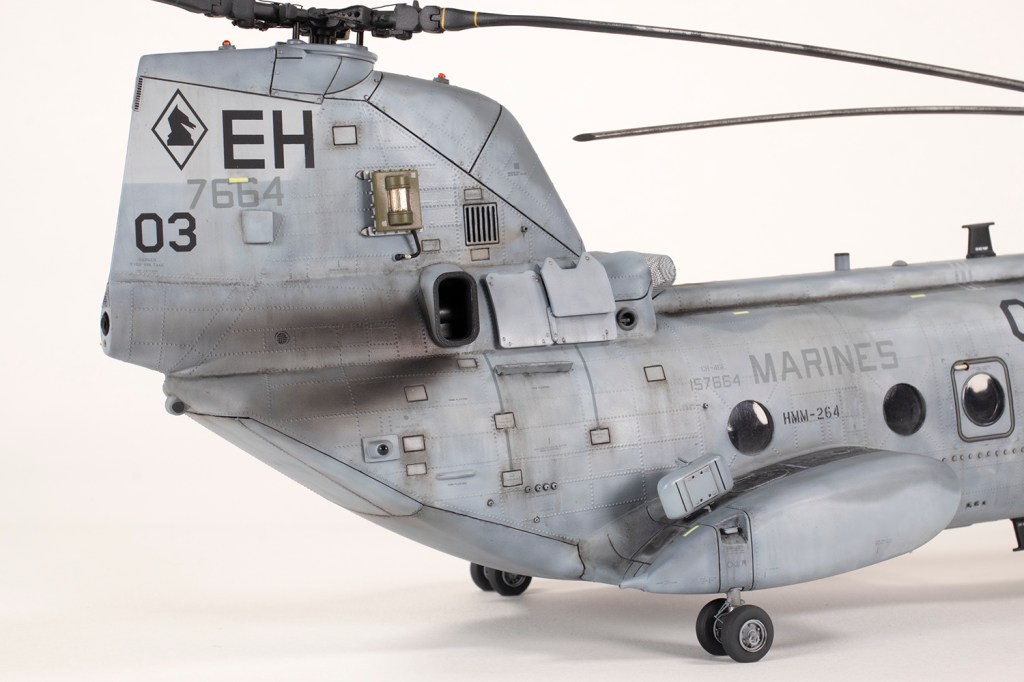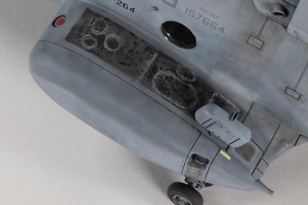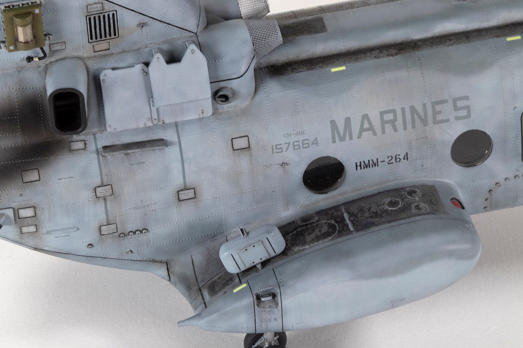Exhaust stains from the rear exhausts are a very distinctive feature of the CH-46 and the pattern is not the same on either side. In fact, the fuselage is pretty asymmetric in general, and Academy did a good job of capturing this. The stains were airbrushed on using MRP NATO Black mixed with some Desert Sand to shift the tone to brown. Further subtle staining was added over the airframe with different shades of oil paint.