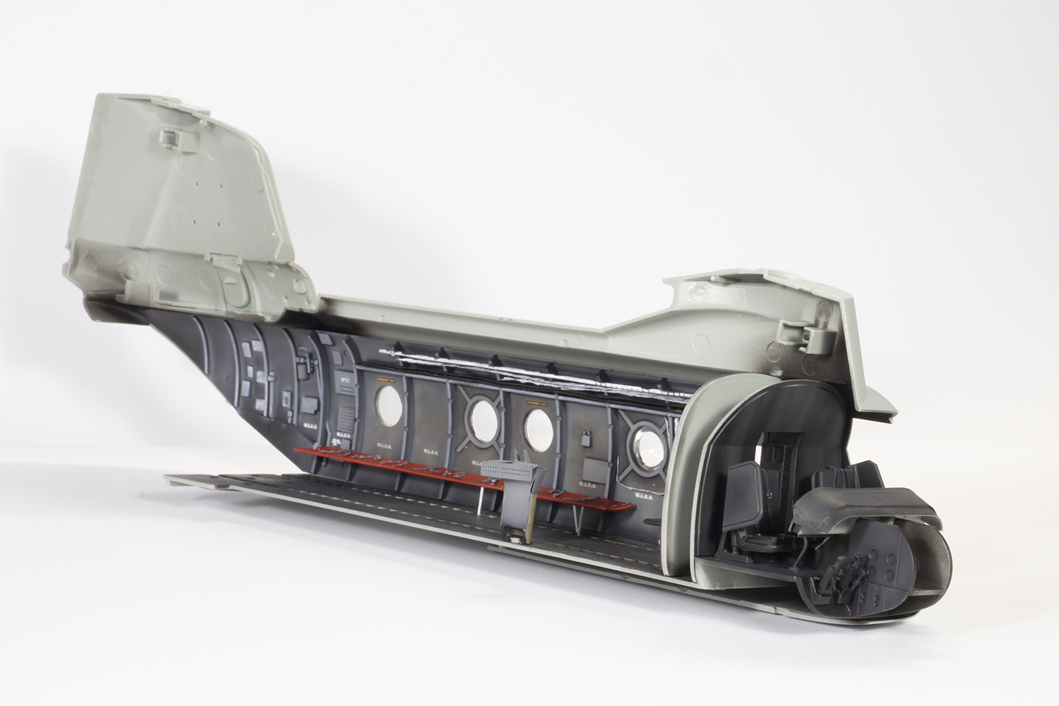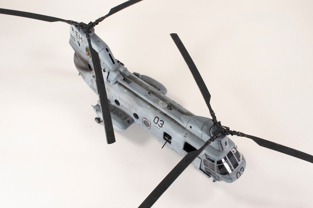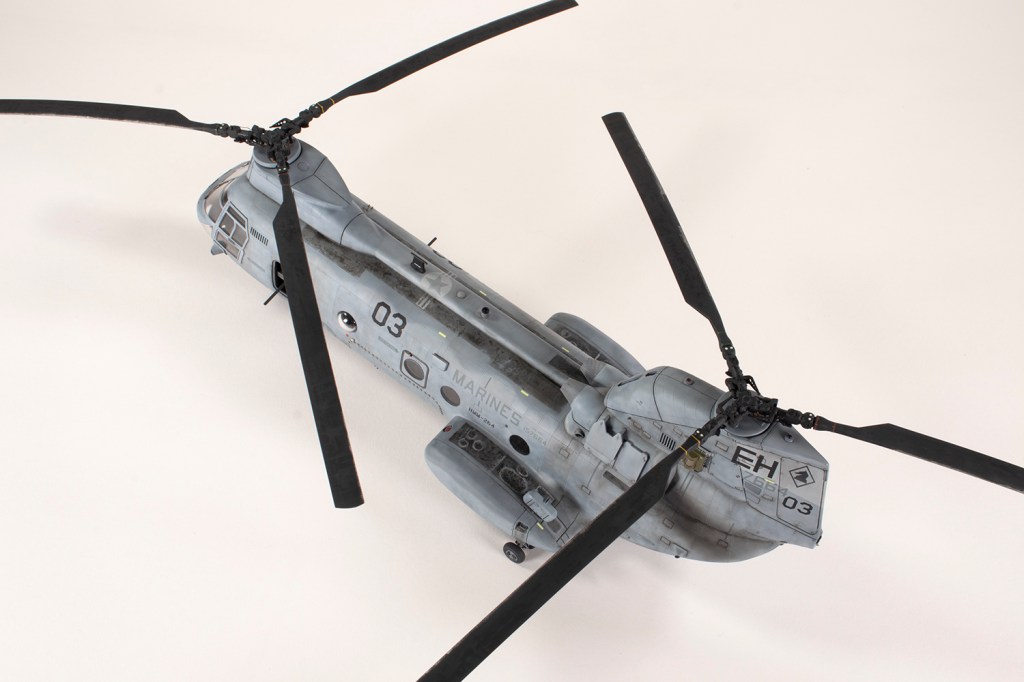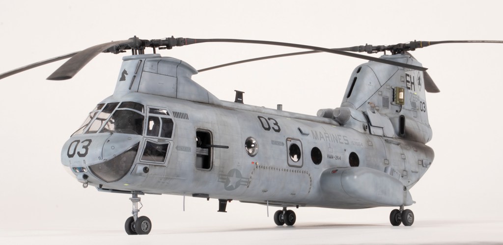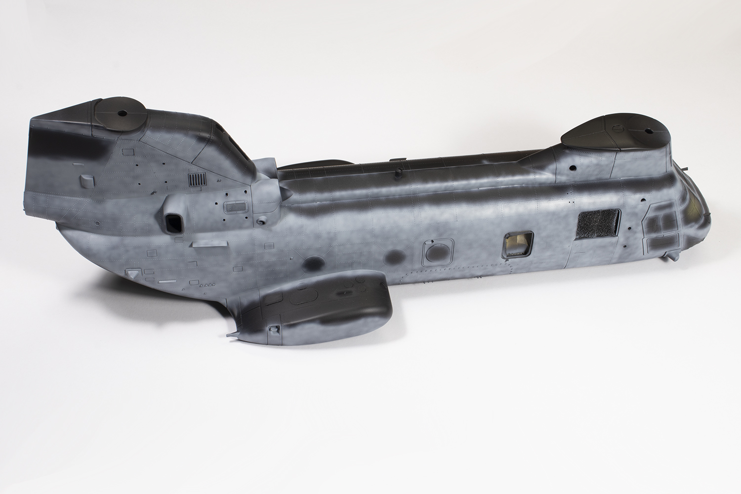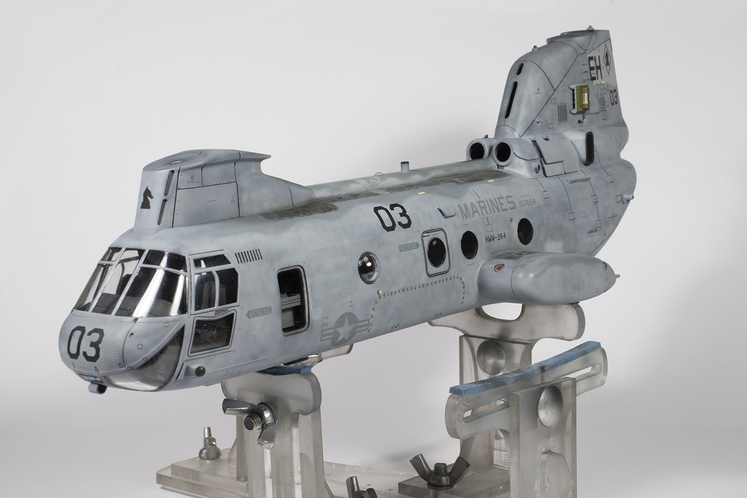 Exhaust stains from the rear exhausts are a very distinctive feature of the CH-46 and the pattern is not the same on either side. In fact, the fuselage is pretty asymmetric in general, and Academy did a good job of capturing this. The stains were airbrushed on using MRP NATO Black mixed with some Desert Sand to shift the tone to brown. Further subtle staining was added over the airframe with different shades of oil paint.