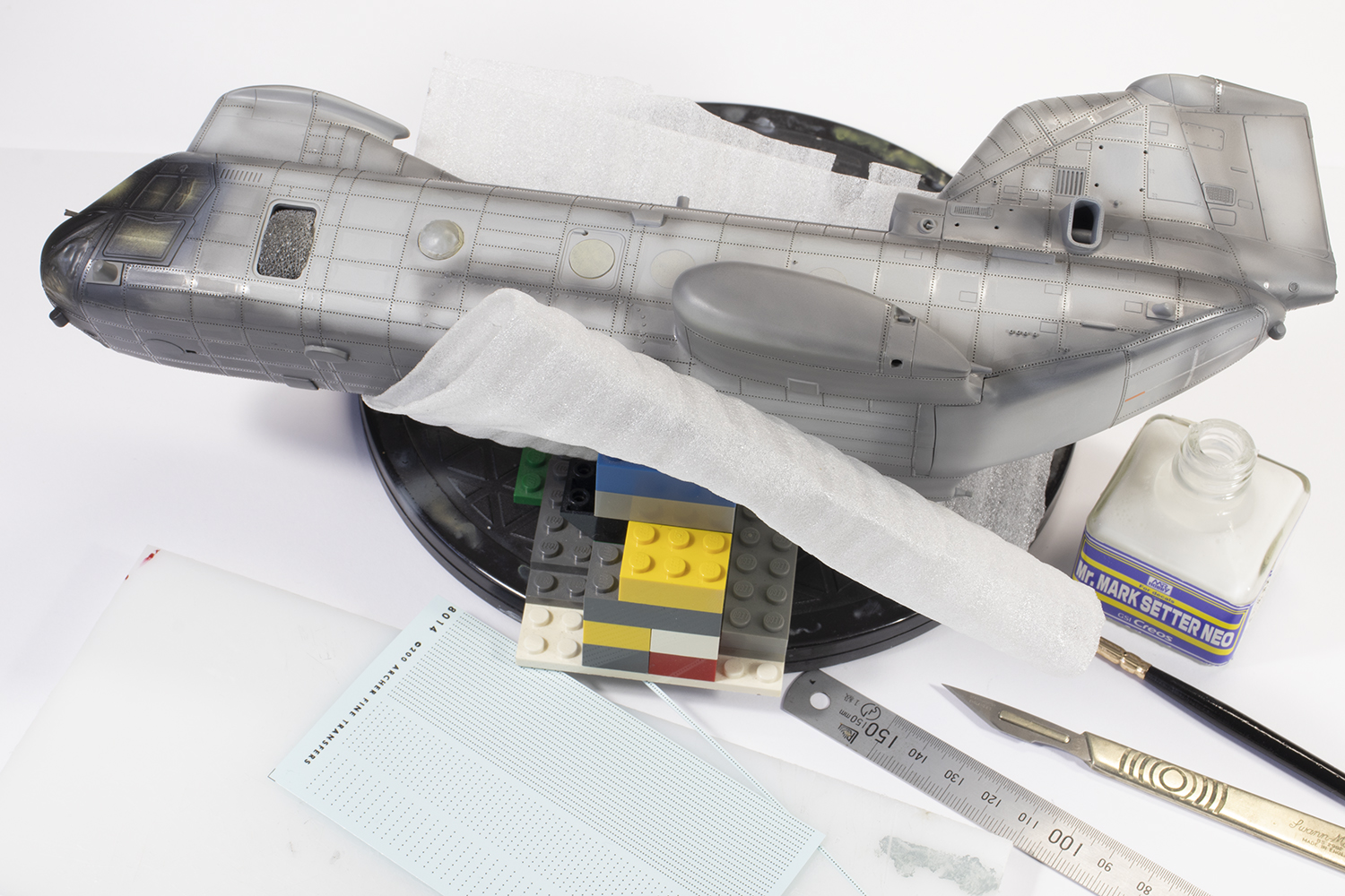 The first point of order was to start with the surface detail. Aside from some prominent panel lines around the rotor pylons, the rest were all filled with thick super glue mixed with VMS CA powder. Second was to address the rotor blades, which should be drooped a little. Using a jig made from a steel rule and a clamp I dunked them in boiling water for 30-40 seconds before quenching in cold water. Unfortunately, I was a little over-enthusiastic and the droop is somewhat over-pronounced.