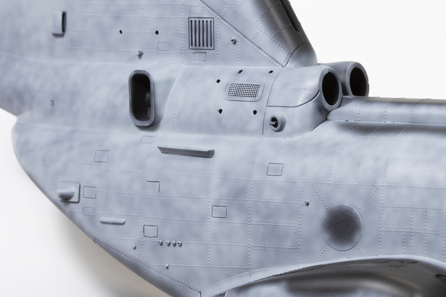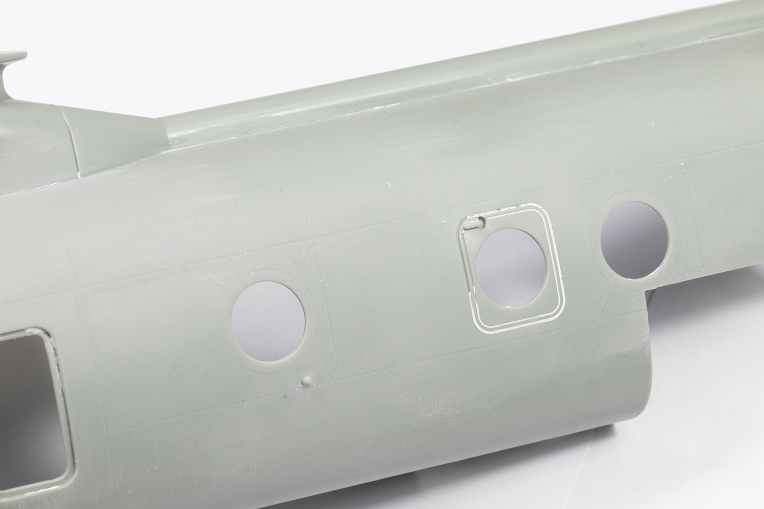 Lots of other changes needed to be made early on. This particular Sea Knight didn’t have the winch fitted, but there are some bolts where it should be. These were represented by some very fine spare parts from Hasegawa A-4 kits. The flotation bags the instructions have you fit to the sides should be omitted, but there’s a lot of prominent raised detail to add where they should go. I punched 0.6mm discs from very thin plastic card; they’re a bit overscale but close enough for me. That would turn out to be true for most of the detail I would add.