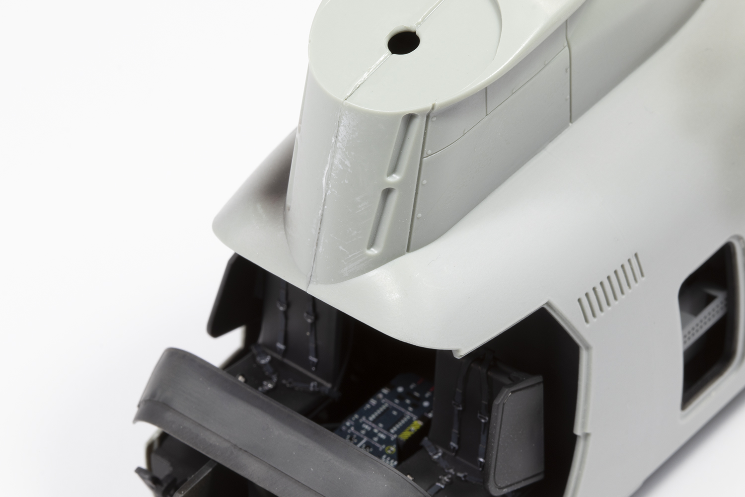 It then came time for the interior to be trapped in between the fuselage halves. As advertised back when the kit was first released, the fit was quite good and I used super glue for all the major joins. The openings at the front of the rear rotor pylon were cut out and filed to shape as this is quite distinctive in photographs. The panels here open outwards, so there should be a panel line along the fuselage seam in several places. Also added to the tail were several handhold panels that were missing; I scribed several but missed a few.