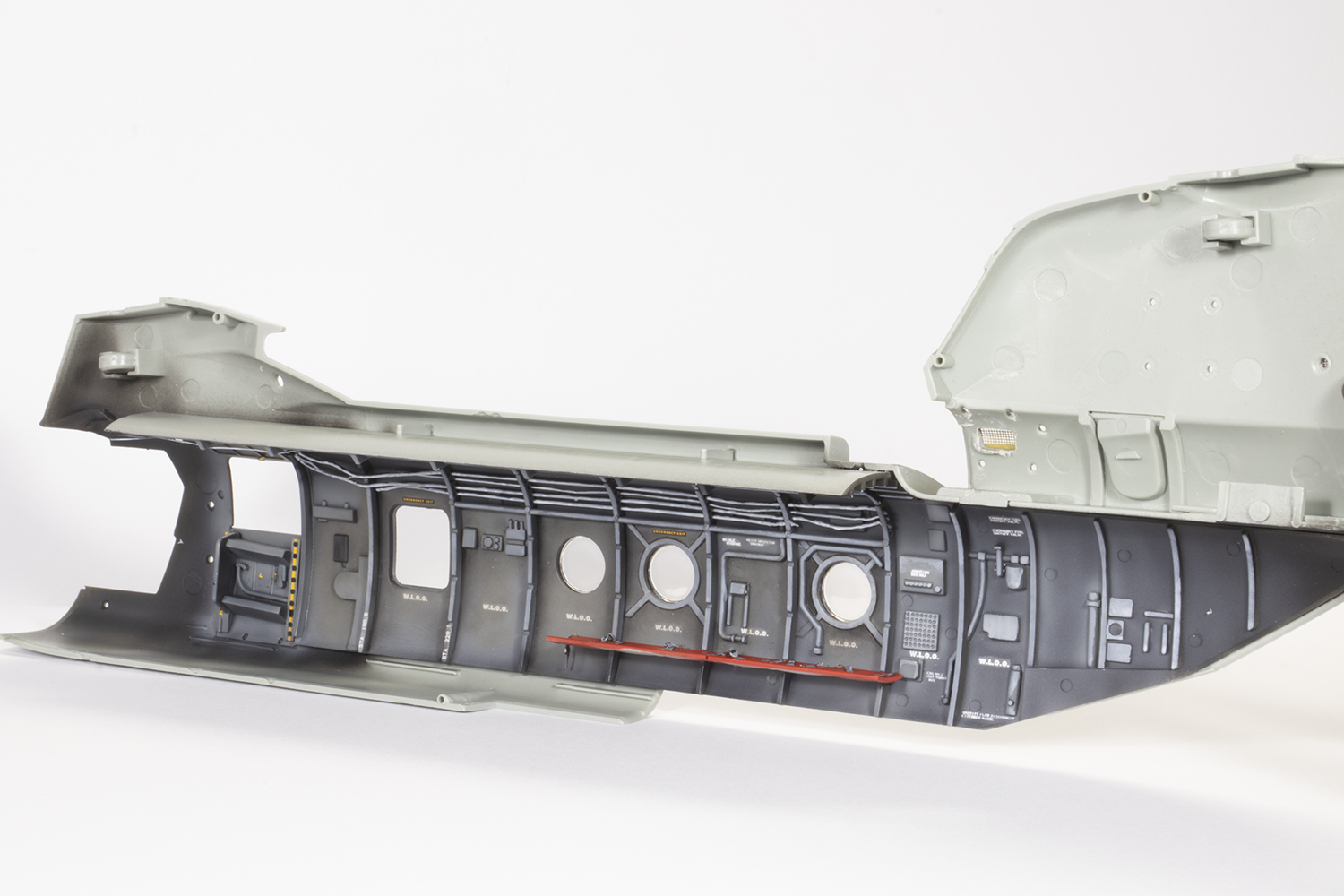 Initially I was quite pleased with the interior provided by the kit, but then I started looking at photos, and realised how much detail was missing. In a fit of stupidity, I thought I’d give scratchbuilding the masses and masses of wiring and pipework that line the interior a go. A couple of hours later I had added a very small amount of badly executed detail and decided to call it a day. I’ve learned that scratchbuilding interior detail is something I just cannot get motivated to do well. Since I planned to close the tail door anyway, fortunately not much would be visible past the guns. This also meant I didn’t need to remove all the ejection pin marks as most of them would be invisible.