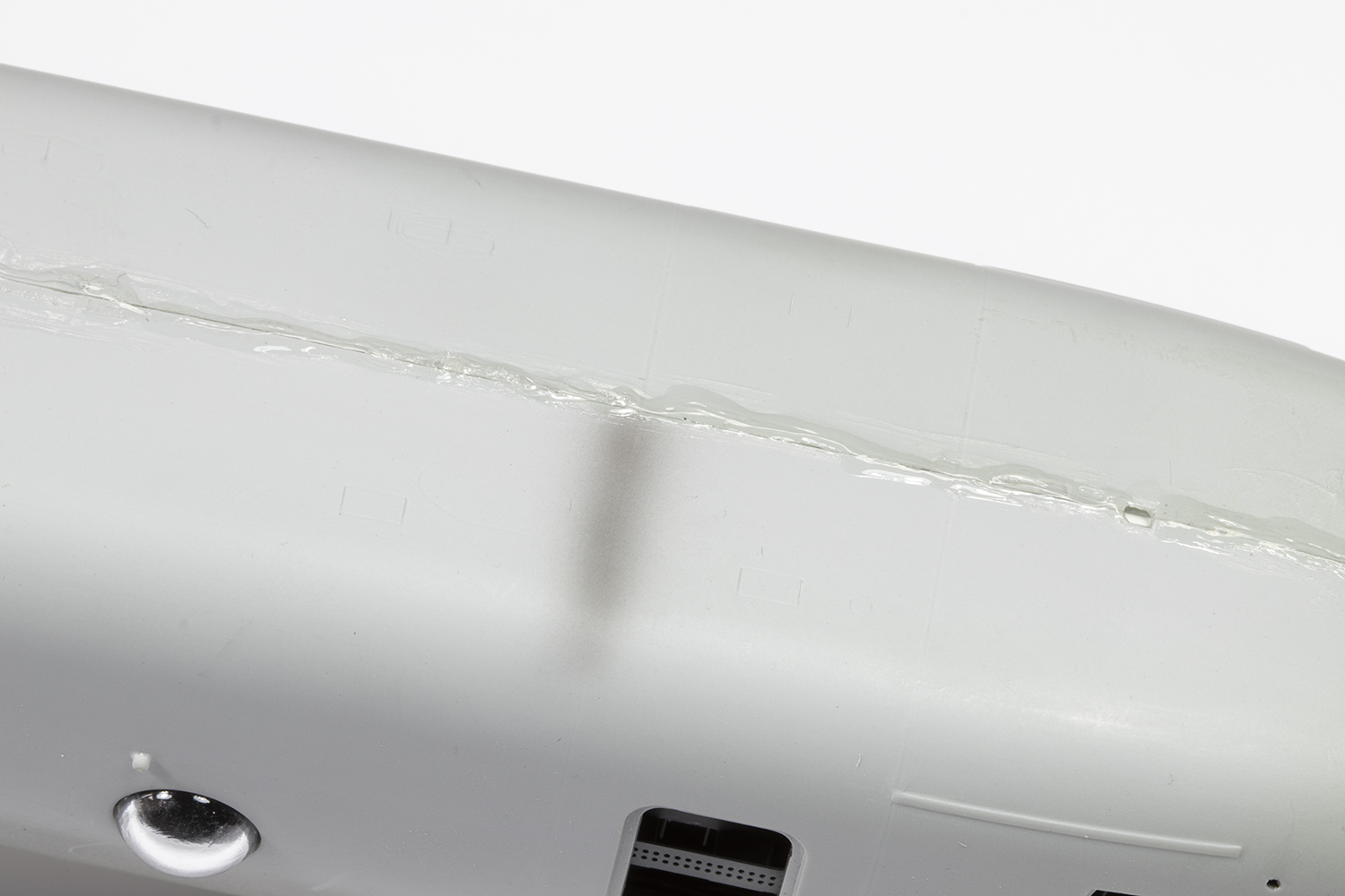 With the fuselage together I needed a decent layer of light-coloured primer to begin the tedious task of adding the rivets. These come on a continuous layer of decal film and needed to be cut into strips. I started with a sheet about five years old and found the decal film quite rough and the adhesive less effective. The newer sheets I had were better, but no matter what I did, I could not eliminate the step at the edge of the film, and this is a flaw that dogs the finished model. Nevertheless, I pressed on, spending about two weeks just adding line upon line of resin rivets. They are overscale, but I still think the final effect is worth it compared to what comes in the box. I settled upon using Mr Mark Setter Neo as the main decal solution, applied under the rivets. The resultant finish is fragile – the rivets are liable to come adrift or flake off in places – but in other areas I managed to get away with some masking over them. They did mean, however, that dealing with any paint flaws by sanding or polishing would be impossible. I do not claim the pattern is accurate, and especially around the circular windows it should be considerably different; I just couldn’t think of a way of getting the circular pattern of rivets required other than by placing them one by one, and I certainly wasn’t going to do that!