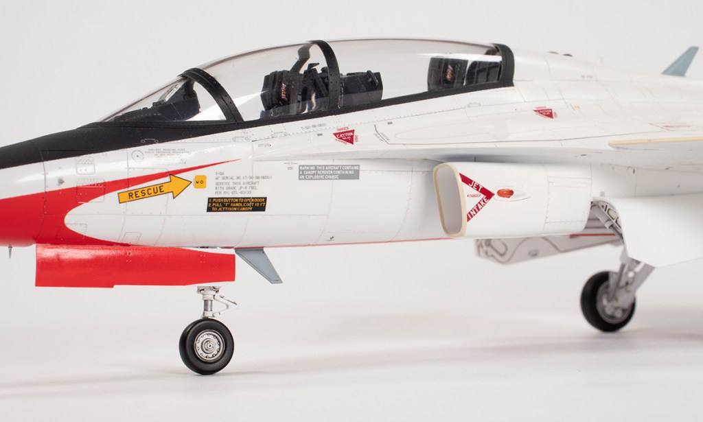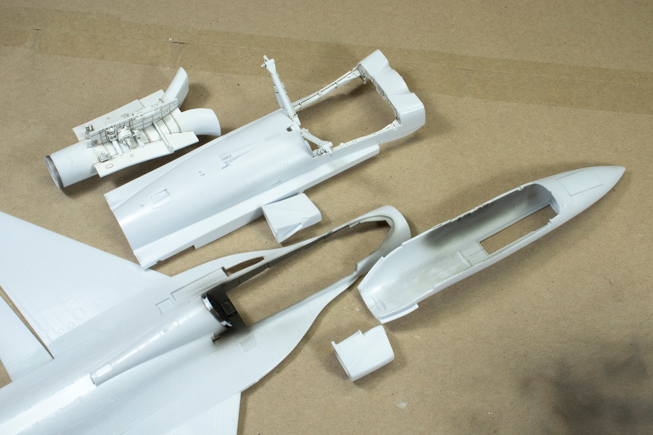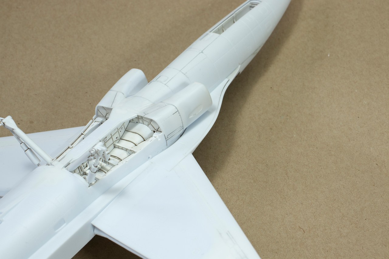 In general, I found the fit to be highly variable. Some parts, like the tail sections and nose, fitted amazingly well. Others, like the LERX panels under the front fuselage, had some horrible gaps that required filling. The latter were extremely difficult to access and were dealt with by using a lot of Milliput followed by more CA and powder. In order to prove the rule that I should only join parts with super glue in order to avoid ghost seams, I did use Tamiya Extra Thin to stick the upper and lower front fuselage halves together. This was because I thought the joint was a panel line. Turns out, it isn’t, and I proceeded to clean the seam up. A week later I had a ghost seam: should have used the CA! Some brushed on Mr Base White 1000 functioned as an excellent filler and was gently sanded out using a 2000 grit sanding stick.