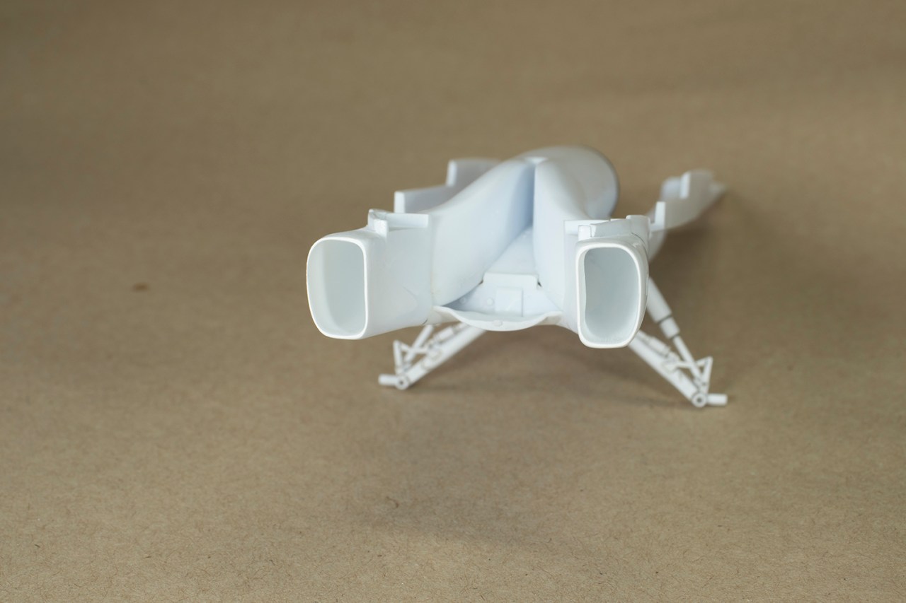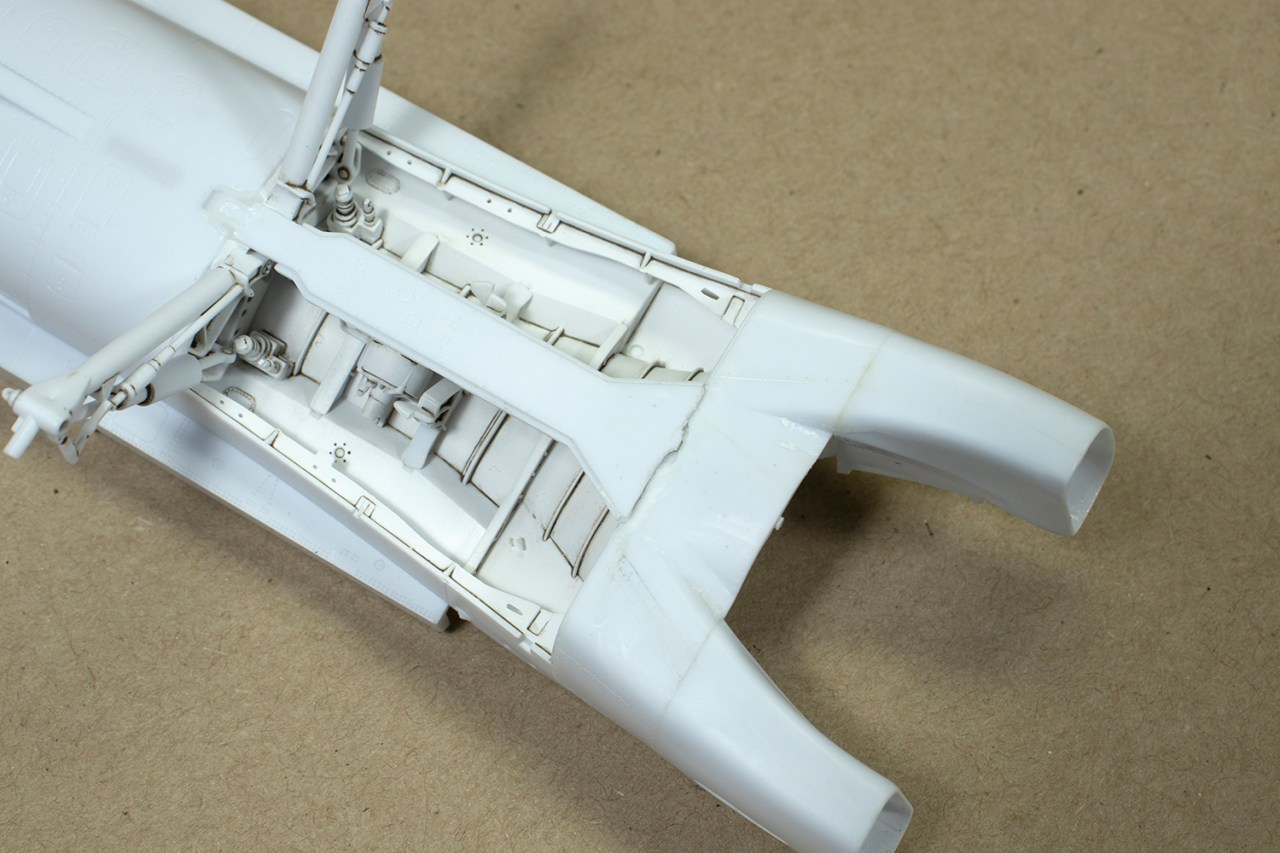 The problem for me was that I could not get the main bay to seat fully down into the lower fuselage half. I didn’t think much of it at the time, but as the build continued it became apparent that this was a critical mistake. The first sign of trouble was that the intake trunking protruded too far forward from the lower fuselage, meaning the intakes wouldn’t fit. Once I’d fixed this with some gentle sanding, it then transpired that the intake trunking did not line up with the intakes.