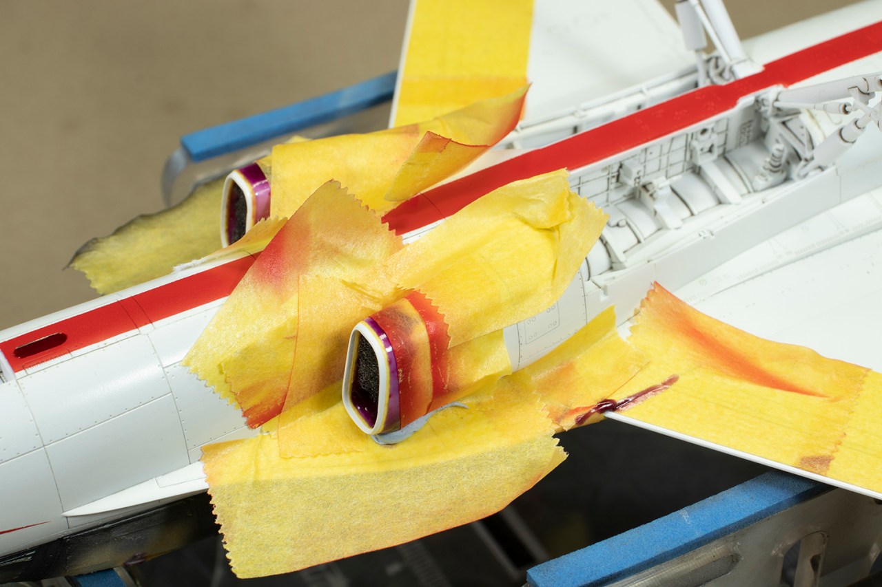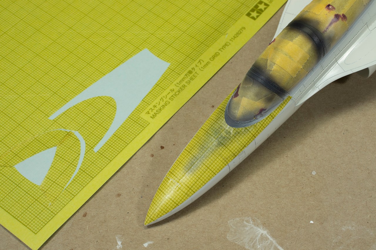 I had actually tried to paint the red on the nose cone in pure red, since it should be a lot darker than the rest of the red trim. This failed, and so I decided to just mask the nose off and spray it with Mr Hobby H95 Smoke Grey. I was much happier with the result.