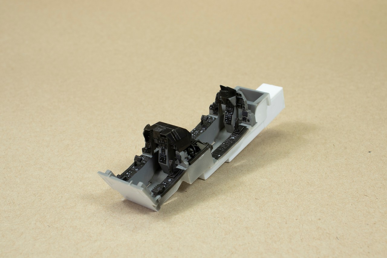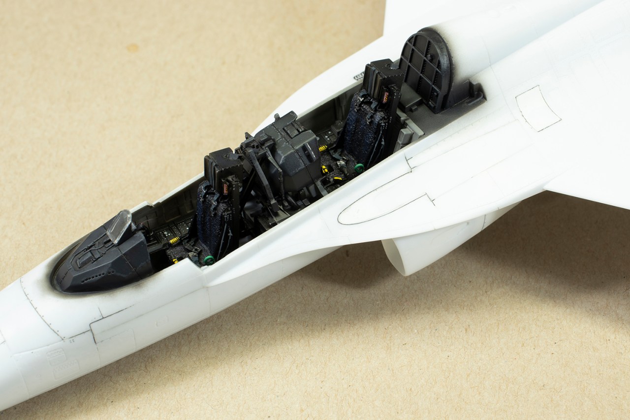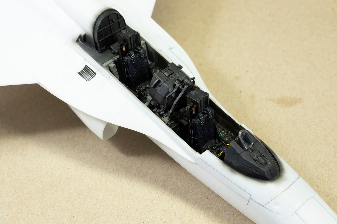 The only concession to aftermarket I made was to get some Wolfpack resin seats. This was less for the detail and more for the fact I hate making seat belts. They are adequate for this purpose, but far from a necessary addition. I found the cockpit to be one of the most complete out of the box I’ve ever seen, including proper separate throttle controls and extensive internal canopy details. The only improvements would have been for some better instrument panel decals and properly detailed upper instrument panels. (These are shown as such in the instructions but the plastic is blank.) As is my wont, I did a very cursory job of the cockpit so I could get it out of the way and onto the bit I like most: sticking the big parts together and sorting the seams out.
