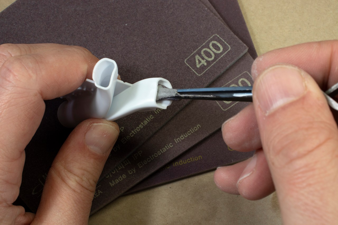 After an indeterminate period of time, stretching from a few minutes to several days (depending on when I can next get to the model), I’ll set to sanding out the super glue using a variety of abrasives. Each of the products mentioned earlier have their strengths and weaknesses. My latest acquisition – the elastic sanding films – are particularly nice as they wrap around my finger and give me a very intimate contact with the surface I’m sanding. The important thing is to start coarse (usually 400 or 600 grit) and work up through each grit (800, 1000, 1500…) to something like 2500. It’s worth noting that grits are rarely comparable between different manufacturers (or even between product ranges from the same brand), which is why I like to confine myself to just one for a given joint. After a polish with the 4000 buffer, you should have a very smooth and scratch-free surface.