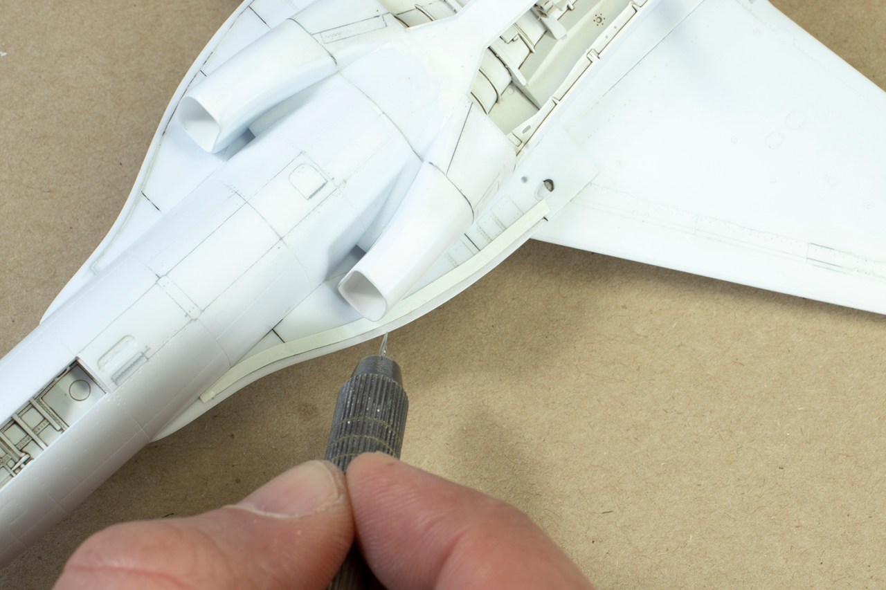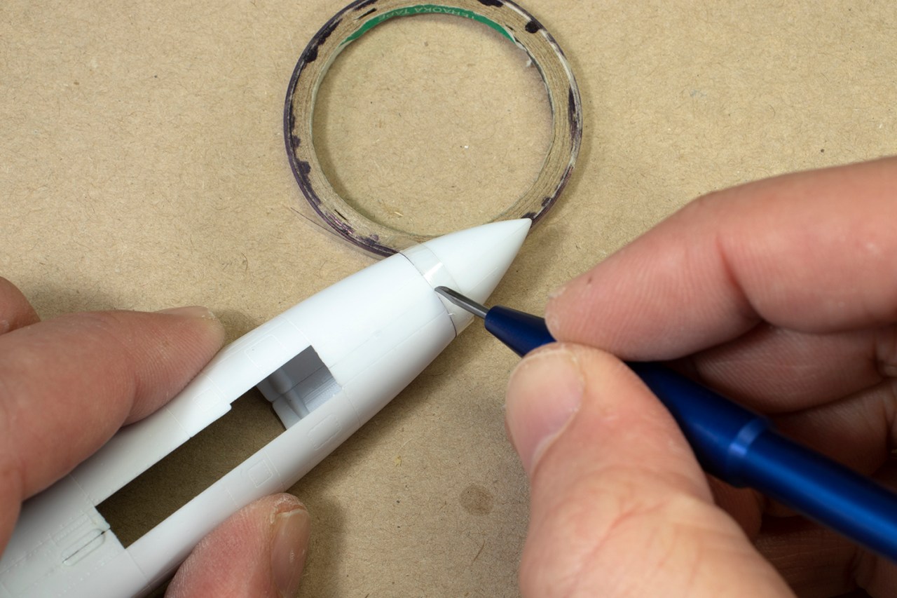 KAI make this aircraft in trainer and armed versions, and Academy have catered for this by providing optional parts for the gun. I obviously needed the blank insert, and this fitted moderately well. Usually, I would have left this well alone, but with my new CA and powder combination, I felt emboldened to see if I could make the panel seamless. As is often the case with panel inserts, the part I had attached sat slightly lower than the surrounding fuselage. The hard bit would be rescribing the irregular shape of the panel edge.