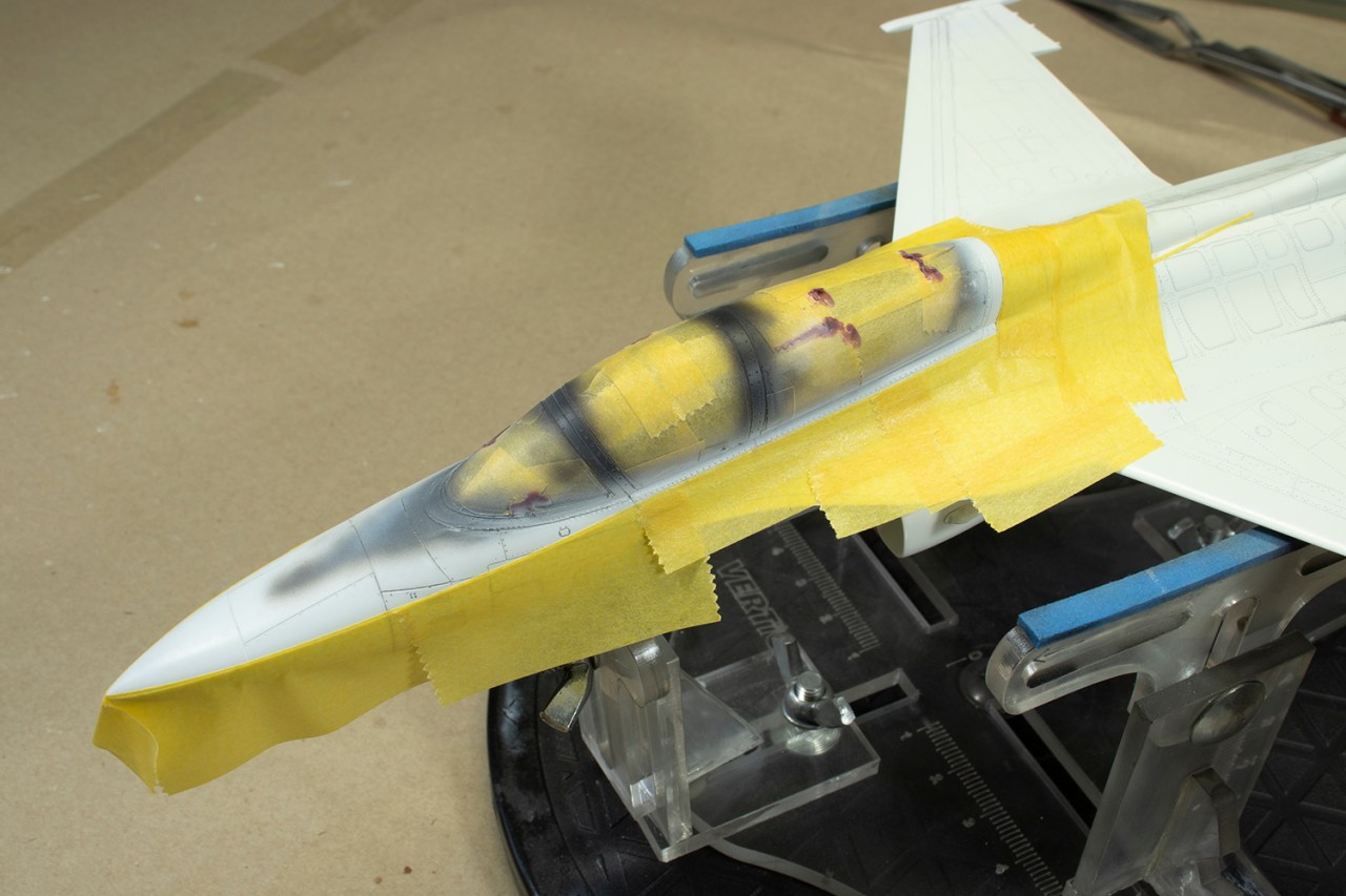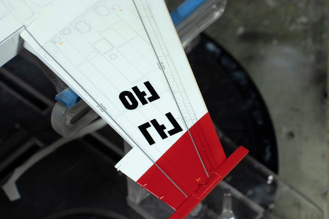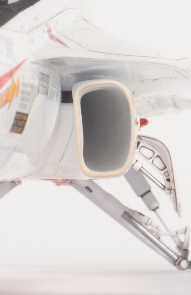 I left off the flaps for painting as I wished to pose them deflected, as is common in photos of the real thing. In the end, they fitted very poorly when deflected, and so I added them in the neutral position. I also left off the tail and exhaust as they fitted very well and could be added later. Having the tail surfaces separate would make the polishing I intended to do much easier. The navigation lights on the intake sides did not fit very well into their recesses and I thinned the bases down using the flat sander. This was difficult as the parts are small and there’s not much to hold on to. The lights themselves were masked using very fine strips of Tamiya tape filled in with Maskol. They look clunky on the finished model and this is one of the areas I am least happy with.