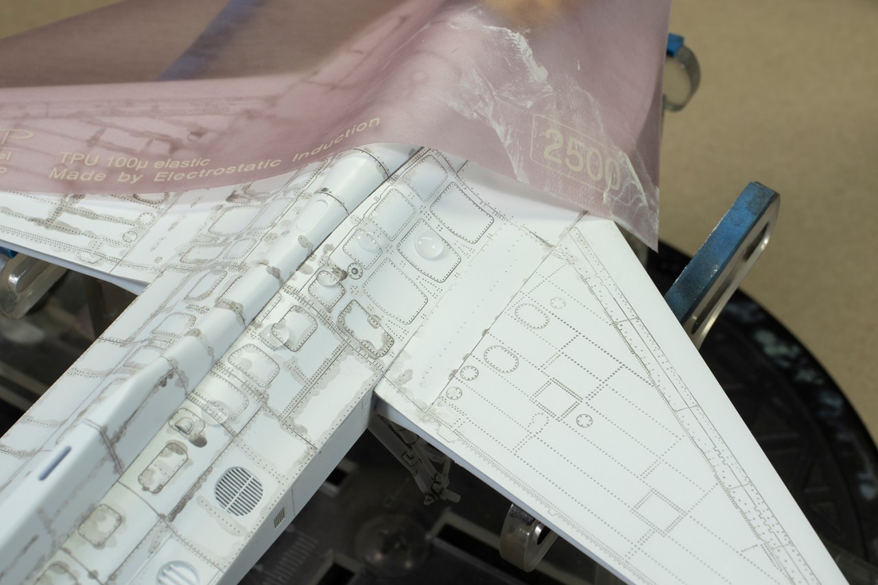 First, several thin coats of Mr Finishing Surfacer 1500 were airbrushed over the entire airframe. On top of this I applied a wash made from mixing Tamiya black and grey panel line washes. These are dense, enamel washes that dry quickly and hard. My plan was to then lightly sand the entire airframe with 2500 grit sanding sponges and film, which would perform the dual functions of both removing the excess wash and smoothing the primer for the subsequent highly-thinned coats of white. This worked surprisingly well.