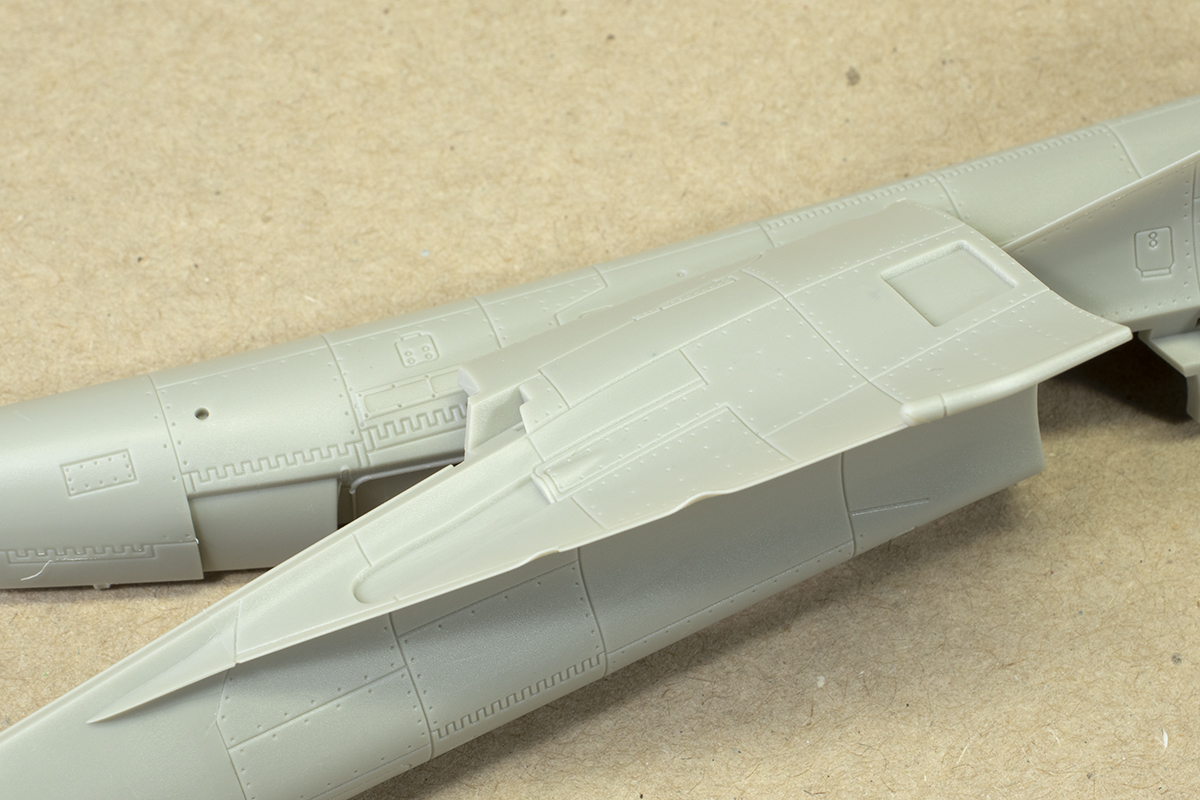 The main fuselage is split horizontally, with the front section split vertically. The fit is not bad. The intakes were less satisfactory and took quite a lot of sanding to blend in, leaving some difficult to restore panel line detail on the underneath.
