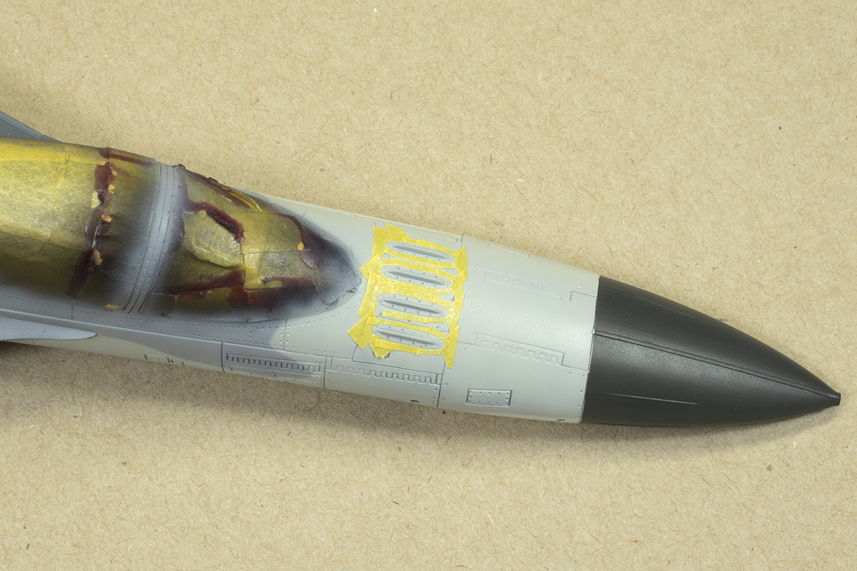 With the tail out of the way, I made a start on the main camouflage scheme. It should be mentioned that the AFV Club diagram is not correct for 1427. Fortunately, the excellent photos online provide enough coverage for the correct pattern to be established (at least to my low standards). The model was black-based and the four-colour camouflage pattern airbrushed in a tight marble pattern or through various mottling masks, starting from the darkest shade through to the lightest. I used Mr Color C305 for the dark grey, C306 for the medium grey, C325 for the light grey, and C69 for the white (which photos show is clearly not white, and so Gunze’s Off White is an excellent match). The nose cone and various aerials are C301.