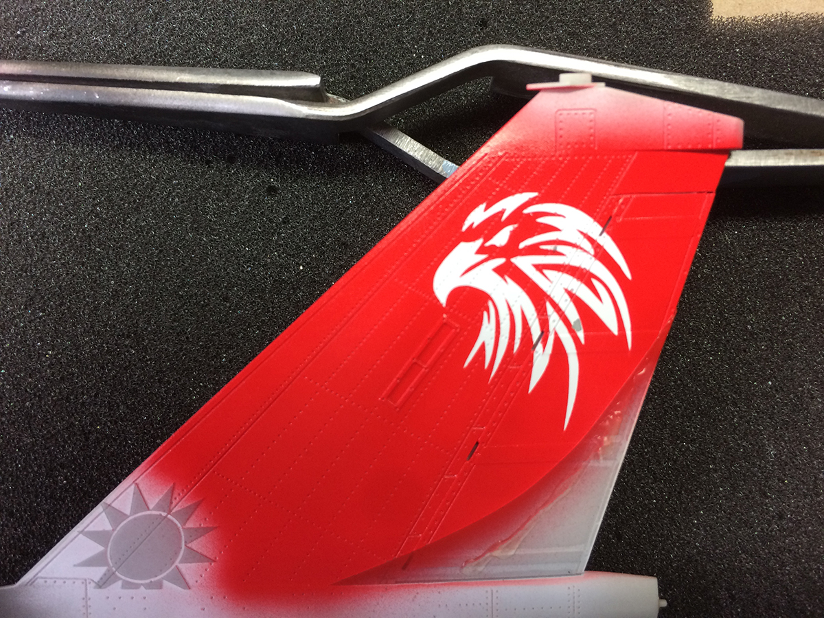 The first stage is to scan the decal sheet and trace the eagle outline using Inkscape. I then cut this out using a Silhouette Portrait 2 cutter. My settings are depth 2, force 2, speed 1 with 1 pass and an overcut of 0.01mm. This is for cutting into Artool Ultramask, which is a vinyl film that comes in a roll. Once cut (and I make several to allow for mistakes), the eagle head design is laid over the tail, which had been airbrushed with Mr Finishing Surfacer 1500 White. Doing that is the really tricky bit. I repeated this for the white and blue flash at the base of the rudder, and the star design at the base of the front of the fin.