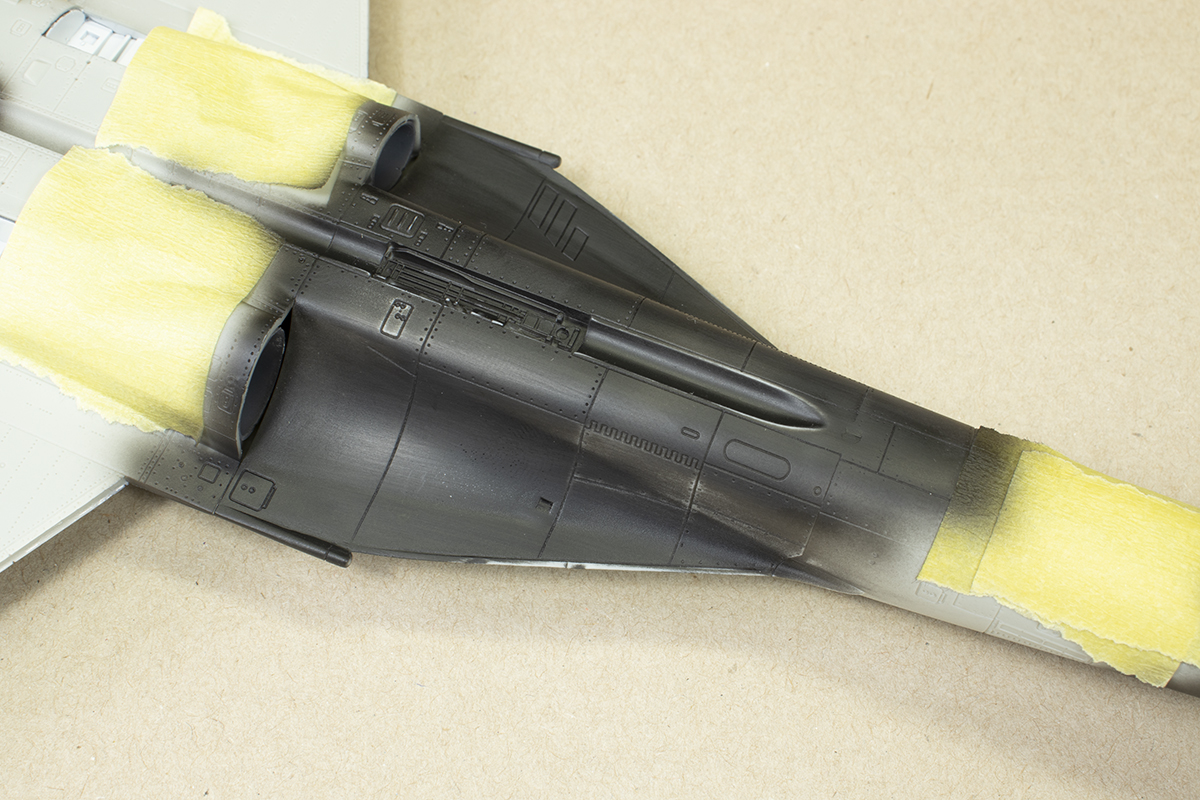 The engine exhausts are a bit weird. They are meant to attach to the full length engines within the fuselage, but these lack positive locating points and mine ended up seated too low. There’s a significant lip where the exhausts meet the fuselage (as if the exhaust diameter is too small), but the parts seemed to be designed this way. Regardless, the way the exhausts attach to the fuselage is not pretty. They were tedious to mask, too.