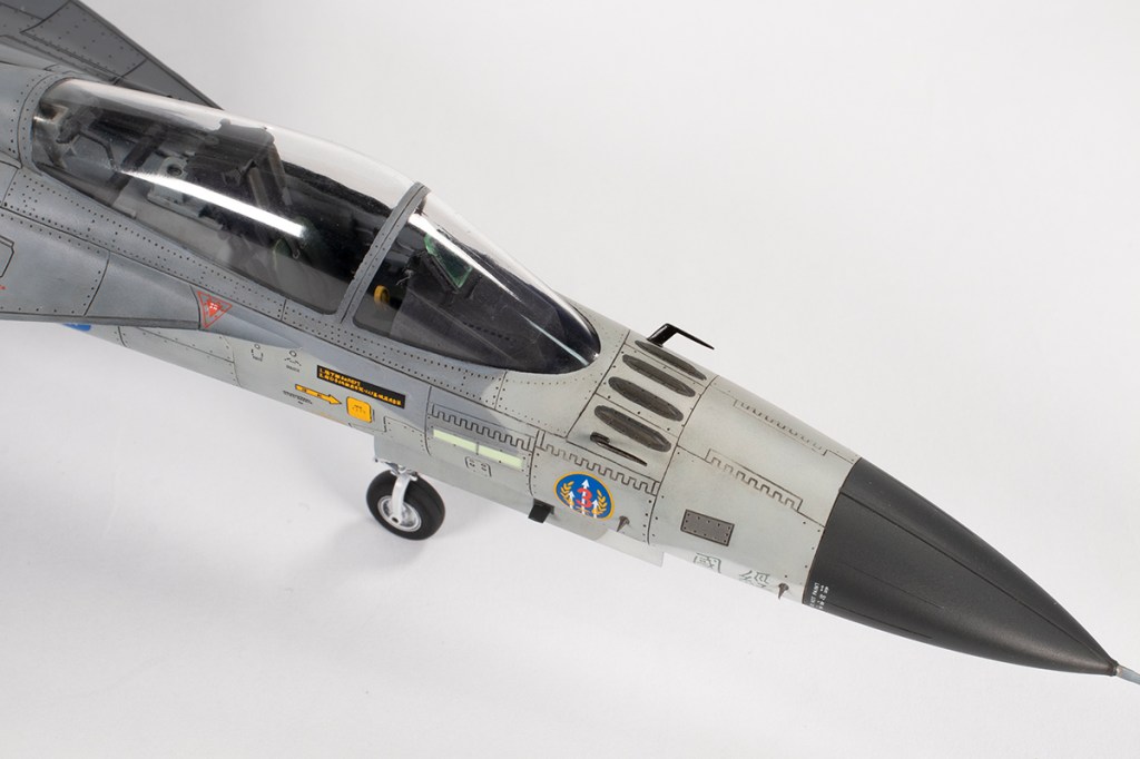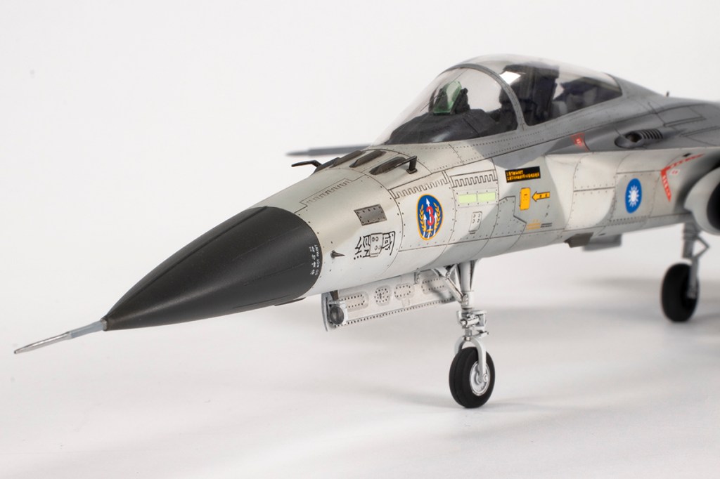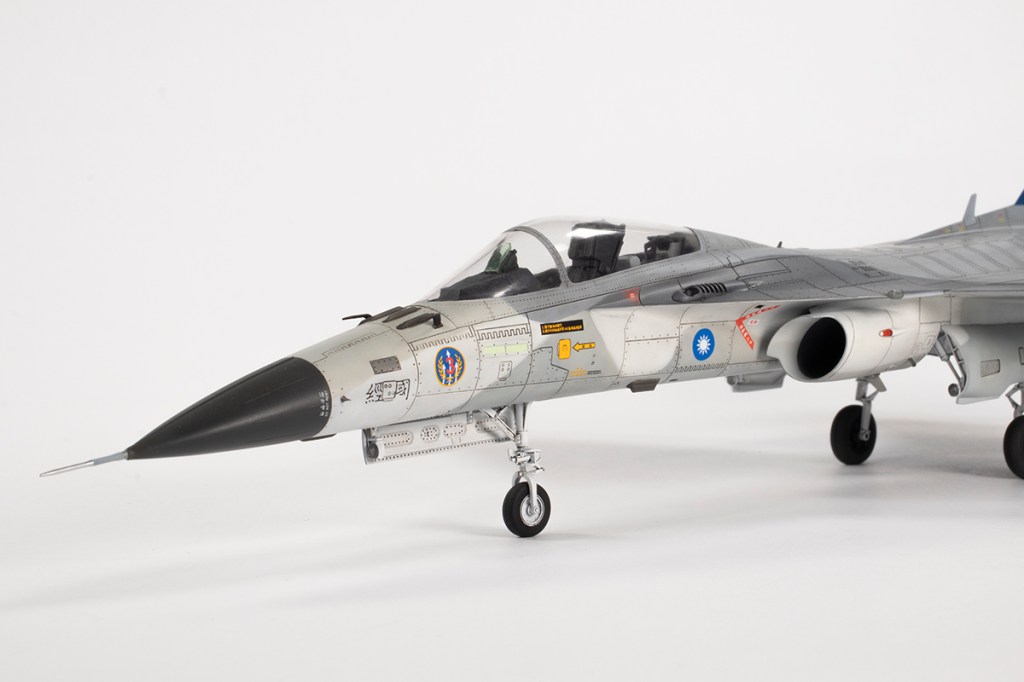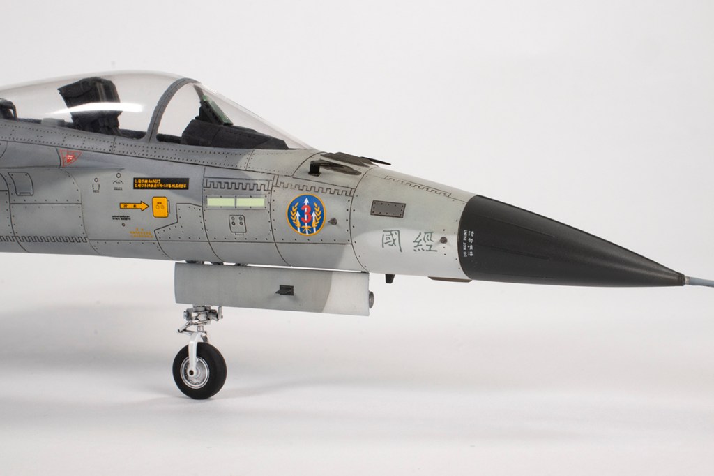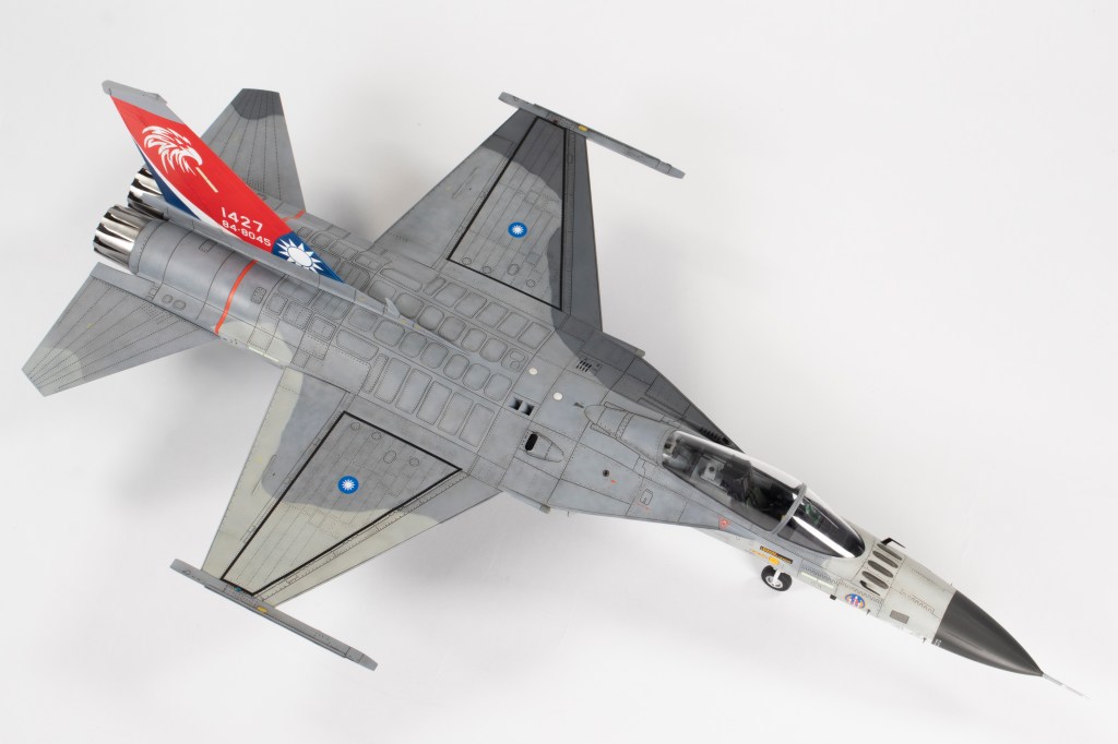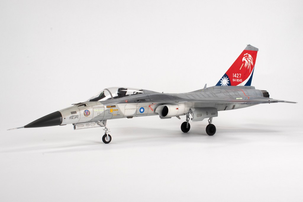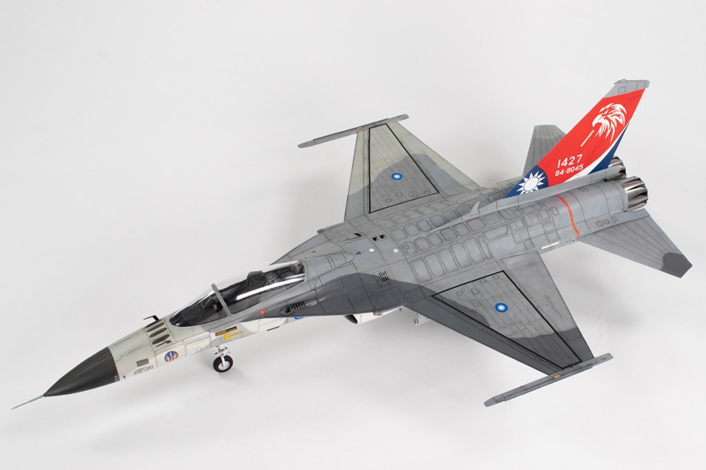 The finished article is a bit of a catalogue of errors: the distorted LERX, lots of little cracks in the canopy, incorrect 經國 marking on the starboard side of the nose, misaligned tail markings, poorly attached engines, etc., but it looks striking enough to me from its shelf in the display cabinet. Not the most inspiring of kits, but the aircraft is much better looking in the flesh than I had supposed from photos, and it’s a nice way to conclude this run of F-16-based aircraft from my stash.