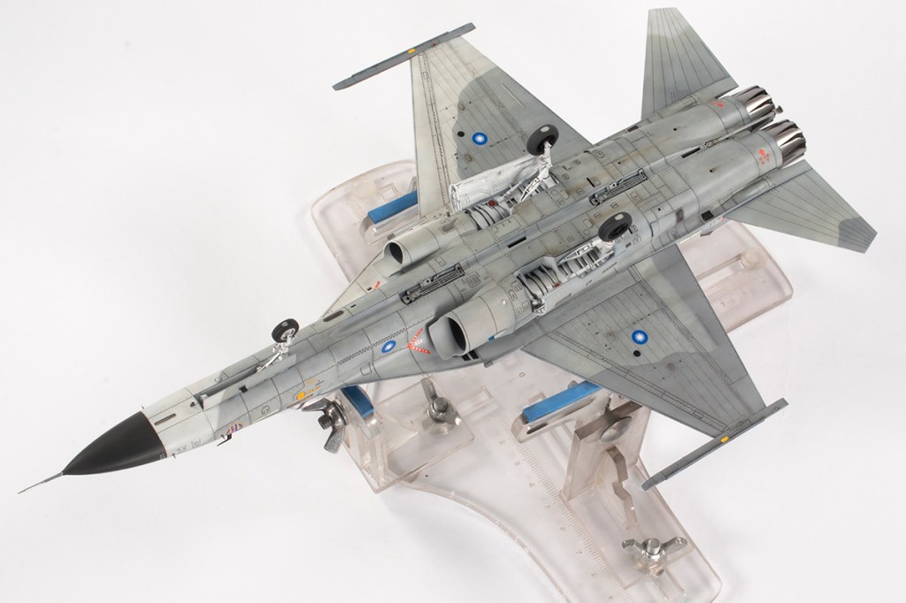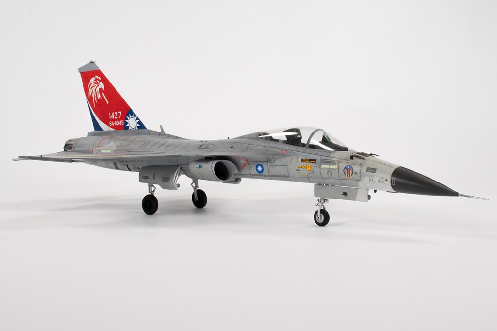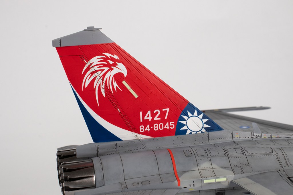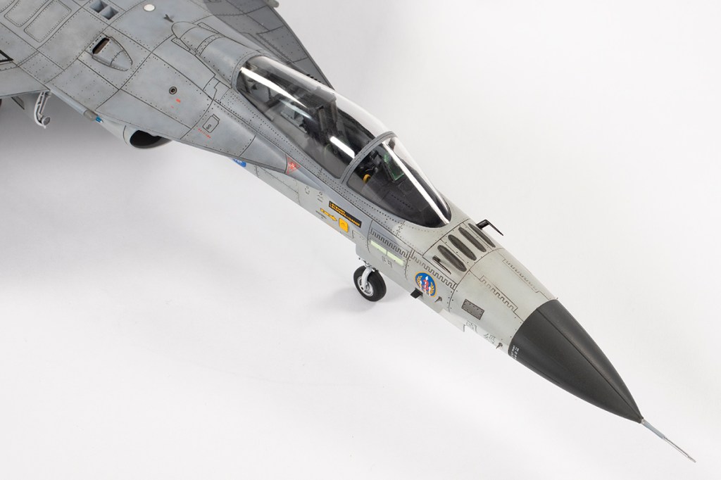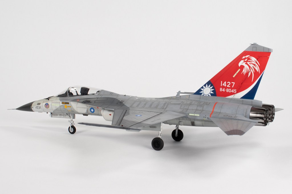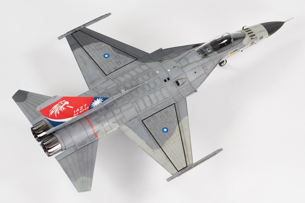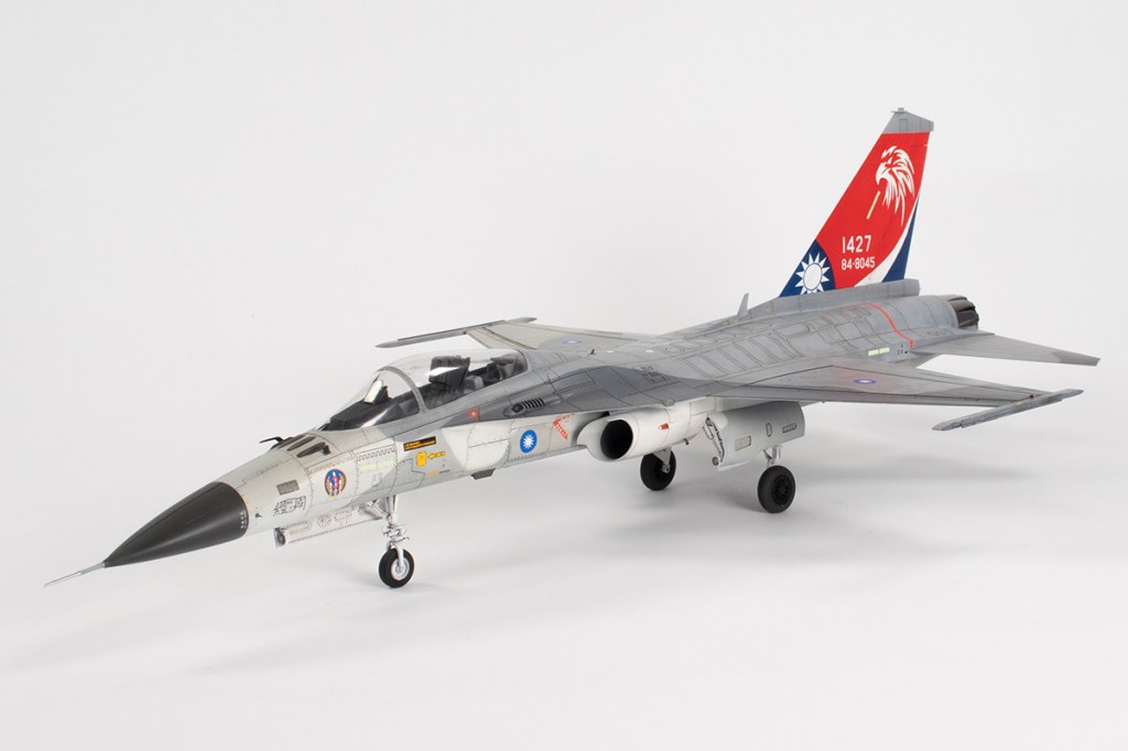 The finished article is a bit of a catalogue of errors: the distorted LERX, lots of little cracks in the canopy, incorrect 經國 marking on the starboard side of the nose, misaligned tail markings, poorly attached engines, etc., but it looks striking enough to me from its shelf in the display cabinet. Not the most inspiring of kits, but the aircraft is much better looking in the flesh than I had supposed from photos, and it’s a nice way to conclude this run of F-16-based aircraft from my stash.