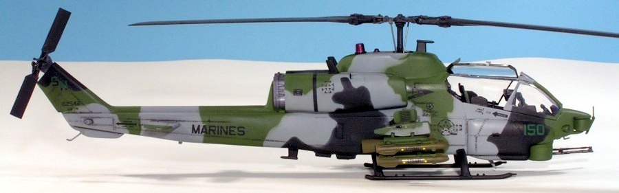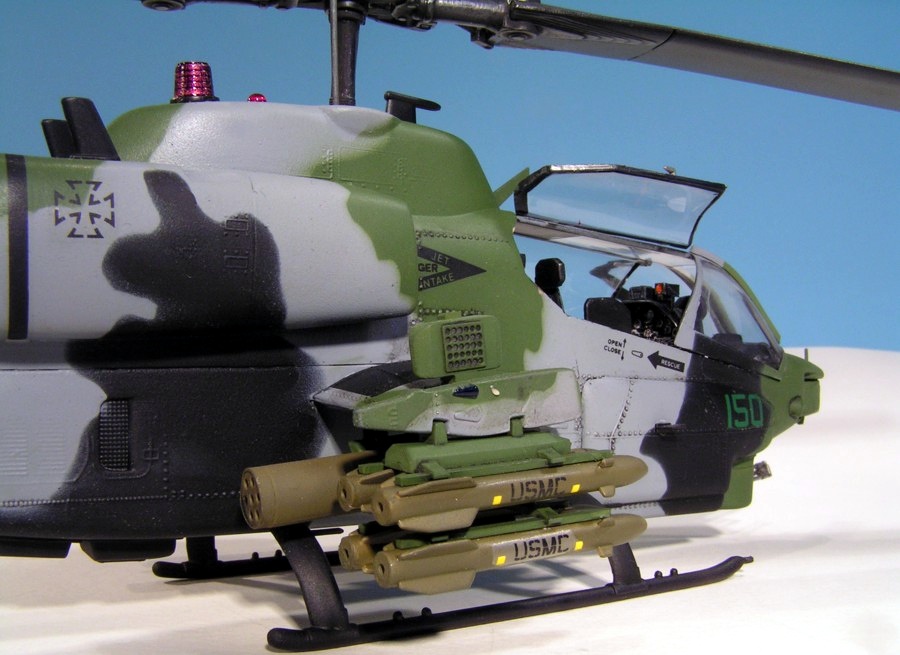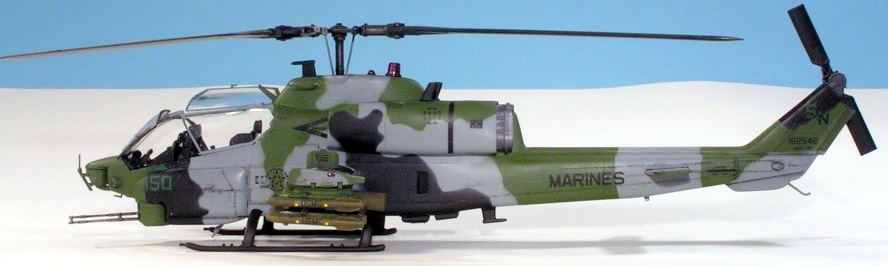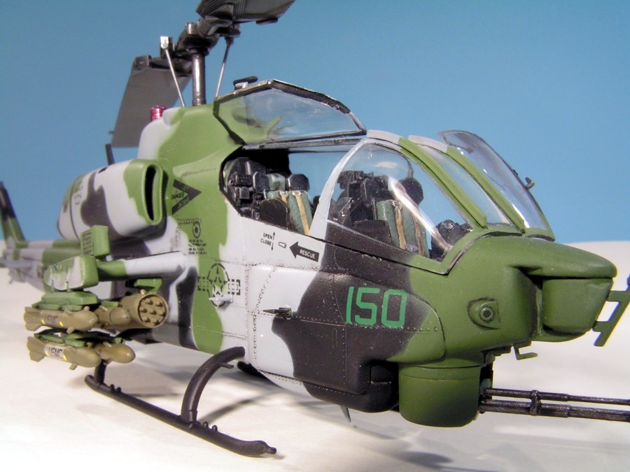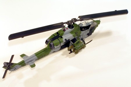 Another helicopter to which I have added Cobra Company resin is this Italeri AH-1W Supercobra. The basic kit is good, but has an inaccurate exhaust area more representative, I believe, of the prototype. The resin upgrade set is basically a completely new cockpit, which is brilliant, and a replacement rear upper fuselage section to correct the kit’s inaccuracy. One other major inaccuracy of the kit is that the rotors are supplied upside-down, which I didn’t discover until I’d finished the model (of course!). I used Humbrol enamels for the finish followed by Johnson’s Klear, an oil wash, and Humbrol Matt Cote. This was fast becoming my standard finishing sequence. The kit decals are typical Italeri; they have a milky white residue and can silver a bit. The Hellfire missiles and rocket pods came in the kit.