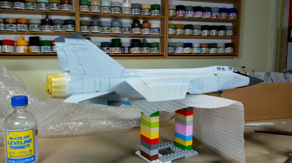 Everything basically clicks into place and before long it was ready for paint. I decided to use the black-basing method again, in an effort to break up the single-colour finish. I sprayed a generous coat of highly thinned Mr Surfacer Black 1500 through my Iwata RG-3, which gave a very nice smooth finish. I then began to lay down a mottle of the dedicated Mr Paint ‘Traffic Grey’ for the MiG-31 though my Custom Micron. This was my first experience of Mr Paint, and although it costs an arm and a leg, it is beautiful to spray.