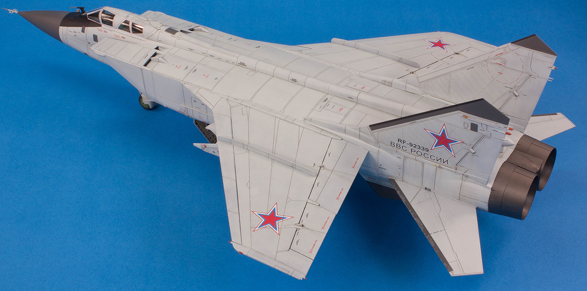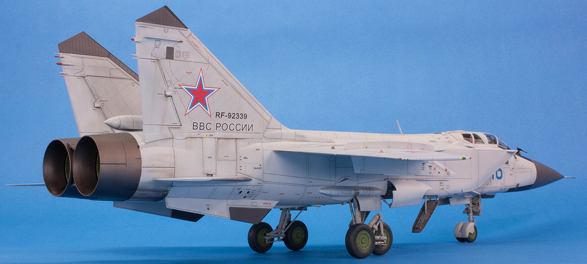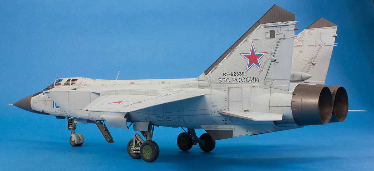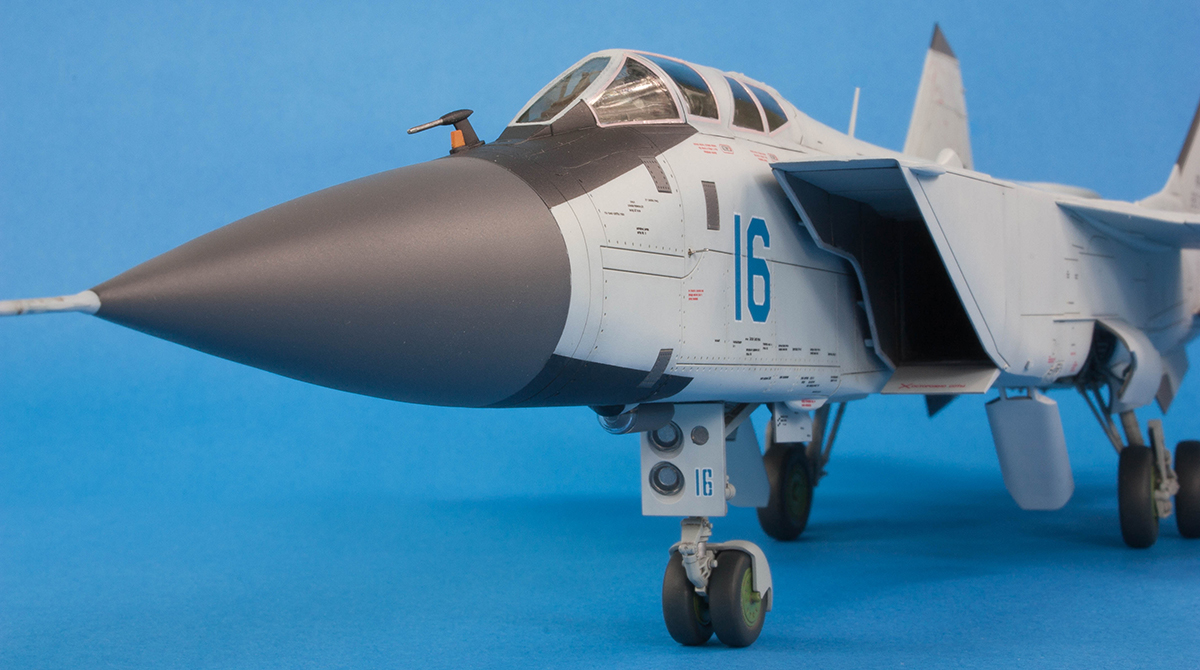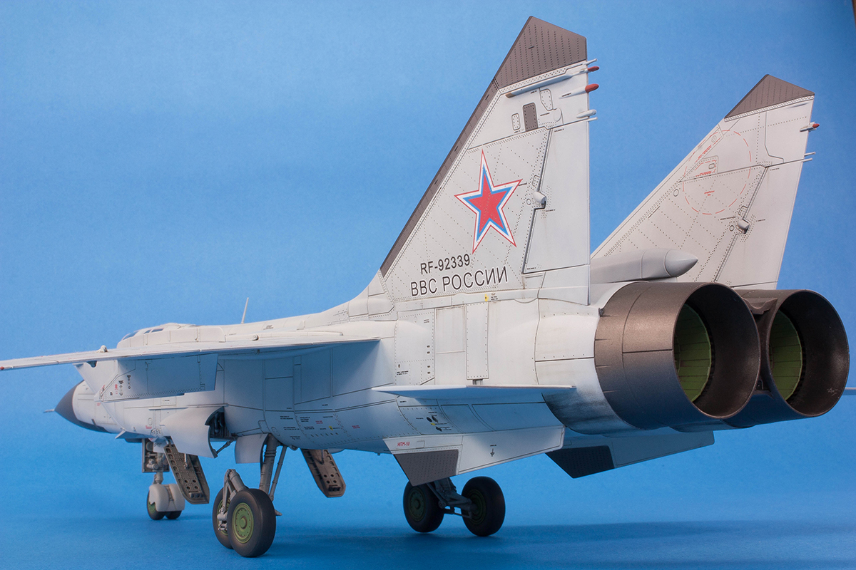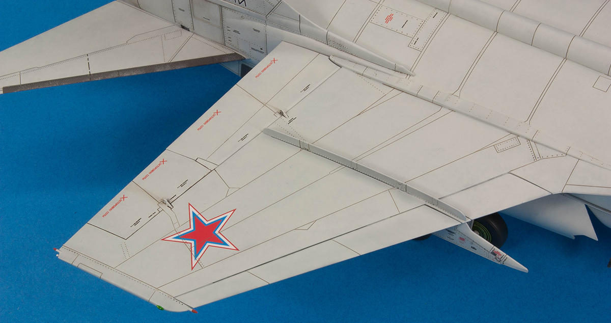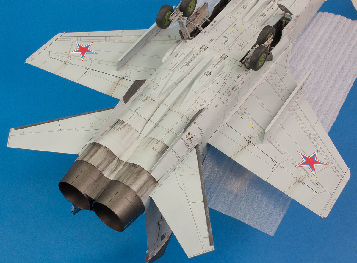 The panel line wash is Ammo’s Medium Grey enamel product, which has a very long drying time and thus remains nice and workable. There are a few photos of Blue 16 from 2014 on airliners.net and the finish is really very clean. I did spend some time adding streaks on the underside, just forward of the engines, as this area gets very dirty on MiG-31s. I used oil paints and AK Interactive’s Engine Grime enamel wash to replicate these, but the streaks are not my best. The same products were used to add some gentle streaking from the flap and aileron hinges and down the rudders.