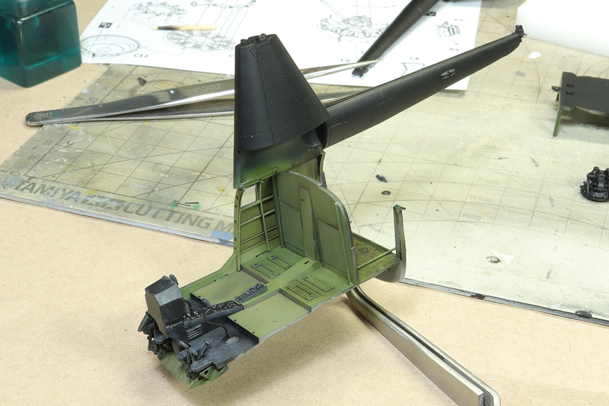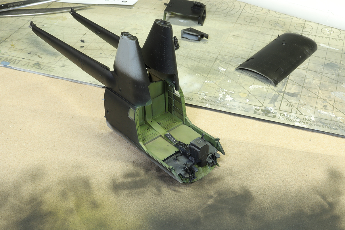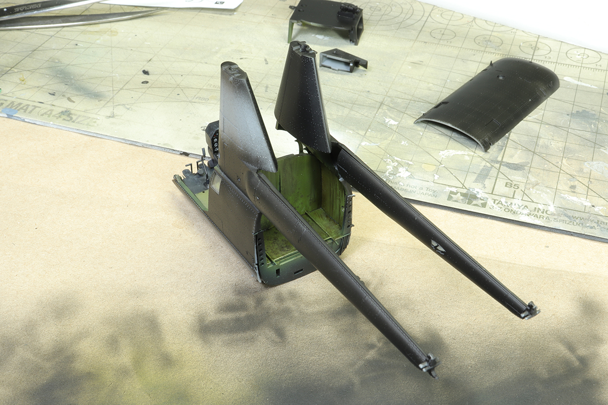 My general approach to building this model was to address seams as I went along and apply paint much earlier than I usually would. So the fuselage booms, for example, were assembled as in the instructions, cleaned up, and then primed and painted in Mr Color 365 Gross (sic) Sea Blue. The same was done for the two roofs, all prior to the fuselage going together. This was because some areas, like between the rotor mast housings and between the twin booms, were going to be very difficult to access later on.