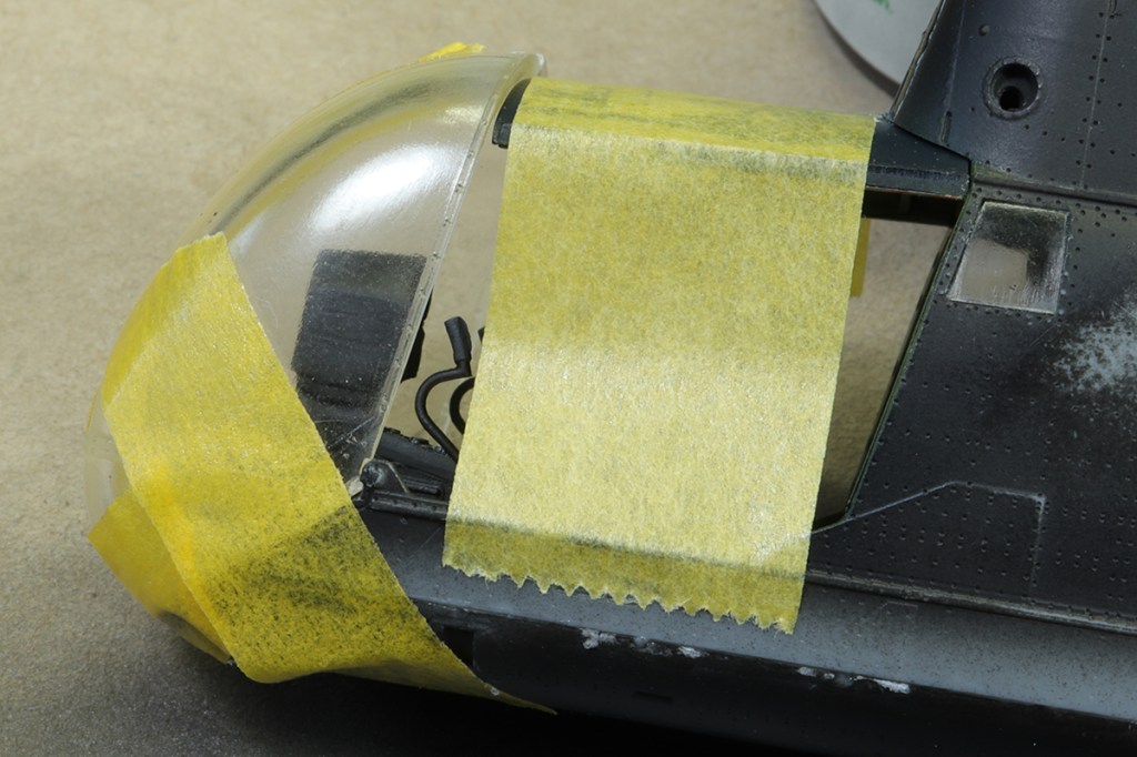 The roof could not bend up as it’s a large and very rigid piece of clear plastic, so the only solution was to cut apart the join between the lower roof and the big front intake with a Tamiya flexible PE saw: