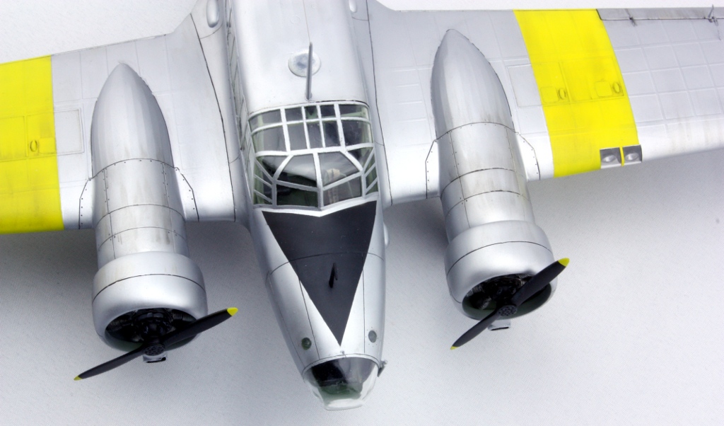 Mr Color Silver was sprayed over the entire airframe, and then the wing and fuselage stripes masked out. I should have done it the other way round; I needed a good amount of yellow to get decent coverage and ended up with a step against the silver. To make things worse, for some reason I decided to use Mr Color 4, which is a bright yellow and, I fear, rather too lemony, and I got the dimensions of the fuselage band wrong. But at this point I was past caring and just wanted to finish! The anti-glare panel was masked by tracing the outline onto a piece of paper, cutting a template and then making a mask from the Tamiya masking paper; it worked very well for this kind of masking.