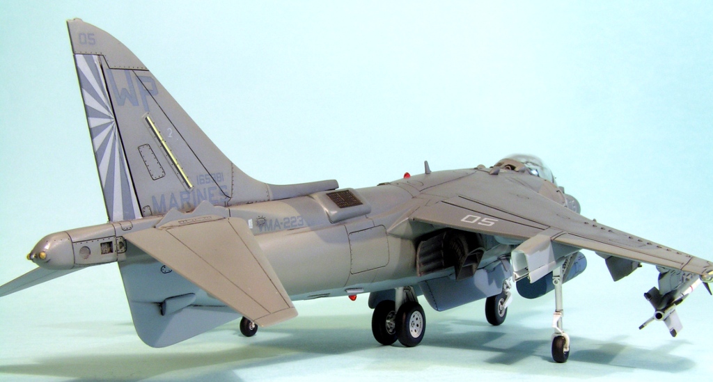 This is part of another twin build, done at the same time as Hasegawa’s AV-8B. Much has been written about Hasegawa’s Harriers, and opinions on the the fit of these kits seem to vary from ‘awful’ to ‘great’. I am firmly in the latter camp. For sure, there are weaknesses (maybe the wing kink is too severe; maybe not), the greatest, in my opinion, being the instructions. If the modeller follows the instructions then the fit will appear to be poor. As I’ve learned with many Hasegawa kits (their Tomcats being a prime example), it pays to dry fit and try alternative construction sequences. One minus point is that I found the scribing to be quite shallow and indistinct in places, so I rescribed both Harrier models completely before commencing construction (that took a while…).