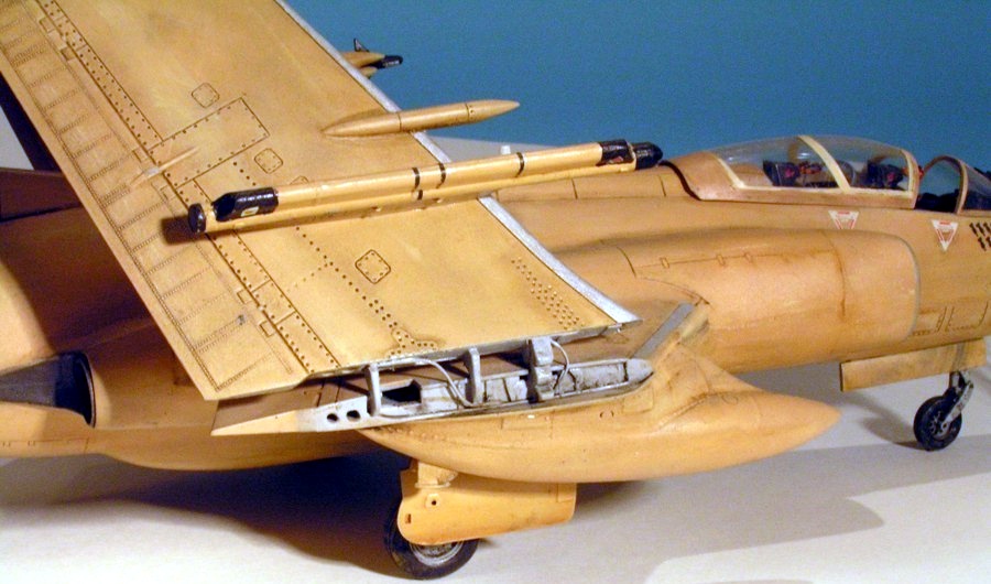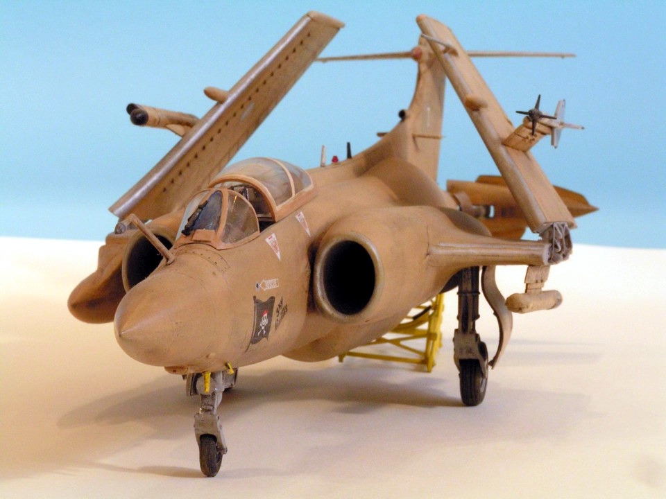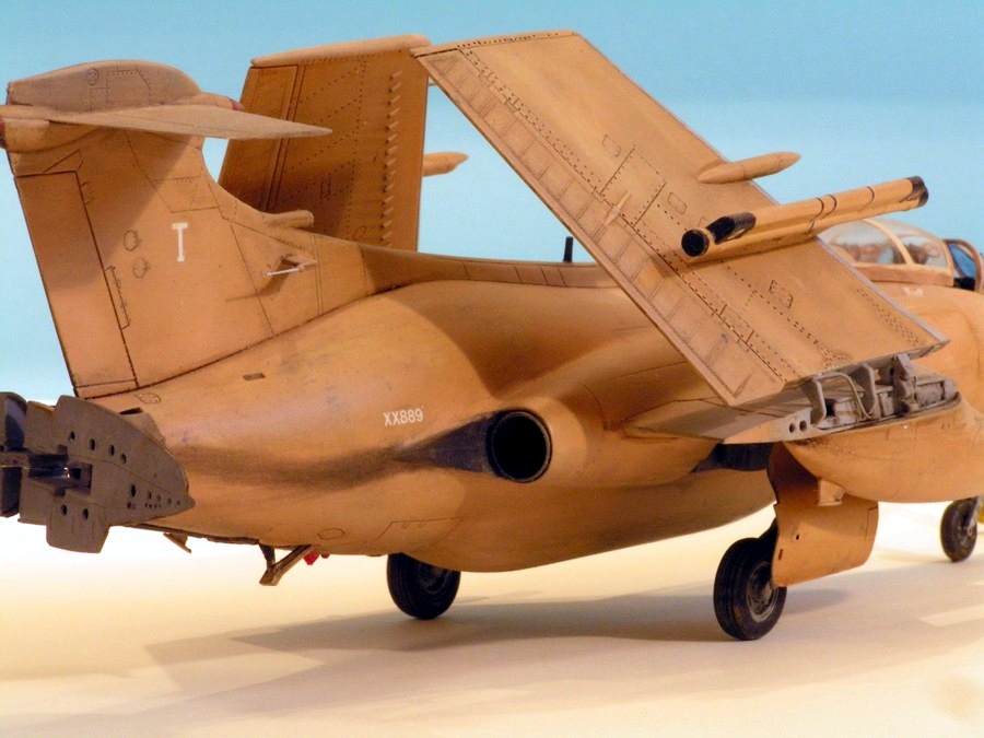 This is the oldest model in my collection, the Airfix Buccaneer S.2B. It was built in the Autumn of 1994 and was inspired by an article in Scale Models International by Jonathan Mock. It’s almost entirely straight from the box, the only additions being some wire in the wing folds and for the pitot tubes. The decals are those that came with the kit. This model was groundbreaking for me in that I used an oil wash (directly over a custom-mixed acrylic pinky colour) and drybrushed some of the rivets. I forgot to add noseweight, and so it needs propping up to keep the nosewheel on the ground. This is a much-maligned kit. It did have warped fuselage halves, but with patience, and plently of clamping and tape, it will go together very well. At the time I was pretty proud of it, but now it looks very ropey alongside many of my subsequent models and stands as a marker of where this present collection began. I have built an S.2 here to a better standard, done in Royal Navy colours with Eduard photo-etch details and resin seats.