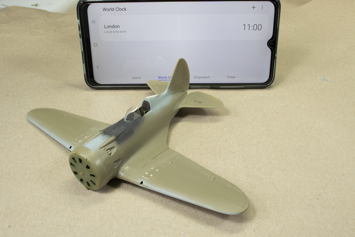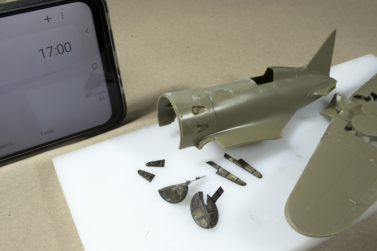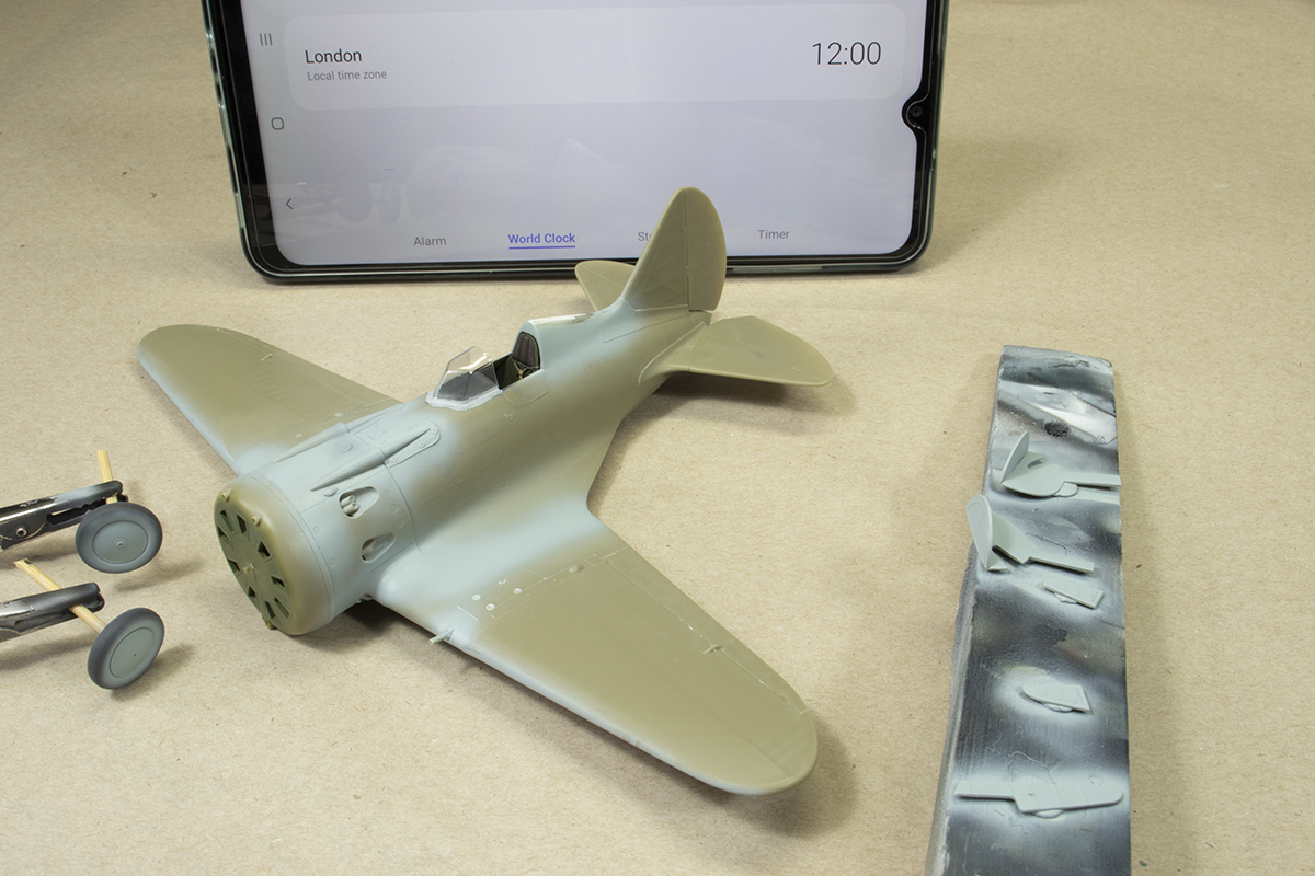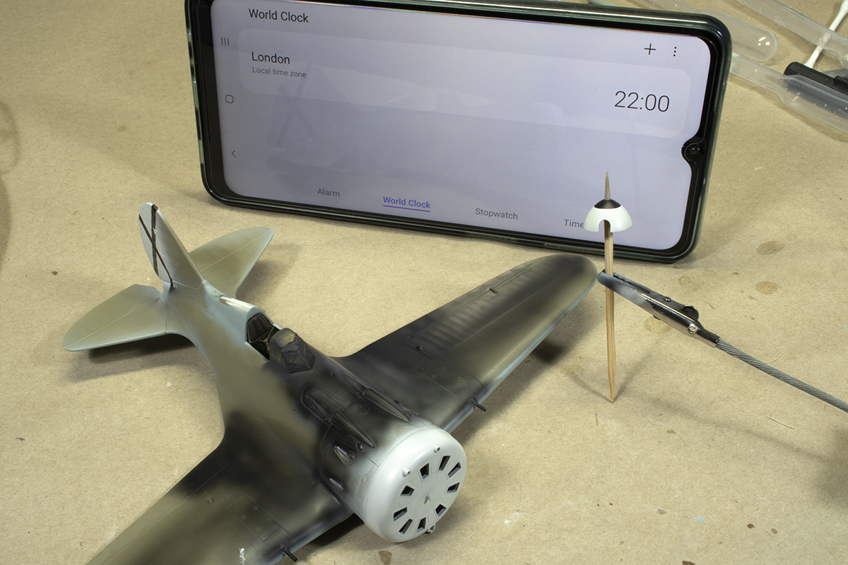 By lunchtime, I’d dealt with painting all the undercarriage (for the second time!) and was double-checking the seam work. The wing guns had been added and drilled out, but these sat at a very odd angle. I kept ignoring that and looking at the clock.