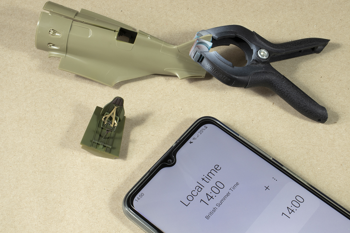 I attached the windscreen using Tamiya Extra Thin, and that would take a while to set. The front cowling took some force to fit over the front fuselage, but it did eventually fit.