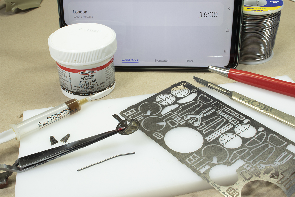 The following hour was taken up almost entirely with photo-etched parts. Eduard supply all the undercarriage doors (there are six) in photo-etched brass, each made up of the door with an inner skin. I’ve been experimenting with soldering PE together, and continued with that here. The problem is, soldering is very time consuming. Tiny, tiny fragments of solder are used along with a flux dispensed from a homemade syringe. At this stage, I realised things were taking a lot longer than I needed them to. Moreover, the attachment points for the doors to fit to the undercarriage legs were numerous, tiny, and each needed folding. I used tiny dots of superglue to fit them to the doors, but they were a real struggle.