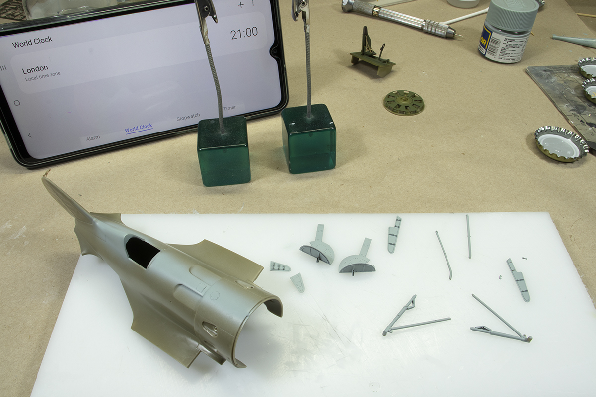 I needed to get to paint as quickly as possible. The plastic undercarriage doors were cleaned and prepped and I cut out the windscreen. I was very relieved to find it fitted perfectly and would just need some blending in with Mr Surfacer 500. The tail planes were not the best fit, but I reckoned I could get away without more seam work in this area.