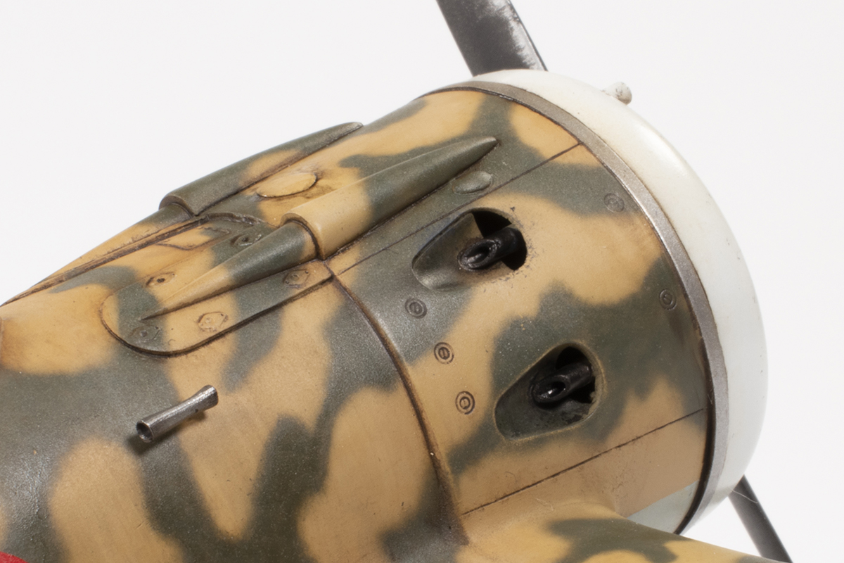 The first correction was the wing gun barrels. I could not live with their wonkyness and replaced them with some brass tubing from Albion Alloys. The next correction was the aileron length; they should extend further inwards. I filled Eduard’s detail with superglue and rescribed new aileron outlines towards the fuselage. With that, and some tea, out of the way, I used Mr Color 69 Off White to airbrush the cowling, spinner and rudder.