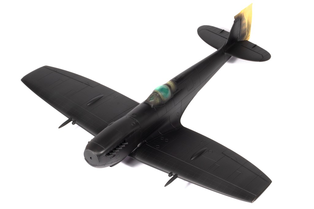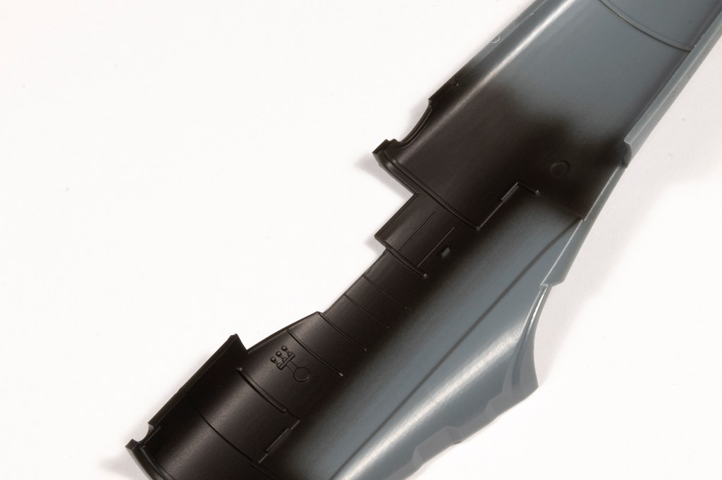 In general, the fit everywhere was excellent, except at the tailplanes. The tailplane halves themselves were an incredible fit, but a bit gappy when joined to the fuselage. Care should be taken in this area as I have seen very nice builds of the same kit with the tailplanes fitted upside down. Judicious application of black CA and VMS filler powder (mixed into a sludge) filled the gaps and made sanding down with an offcut of Infini 400 grit sanding stick very easy. I like to cut these sanding sticks into different shapes to make access easier – all you need is a stout pair of scissors. The very finely-moulded surface detail (mainly the rivets) is at risk of obliteration during sanding and I like to deepen it (in this case with an MRP needle scriber) prior to sanding so that it is retained. Once hardened, the join can be reinstated with a scriber using Tamiya vinyl tape for curves as a guide. This is not an ideal guide because the tape is soft and liable to deform, but it’s that same flexibility that allows the curved line to be rescribed. Just go gently and make multiple light passes with the scriber.