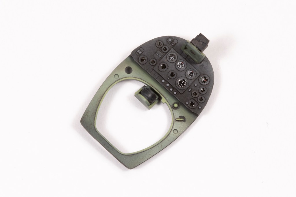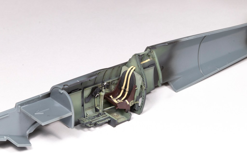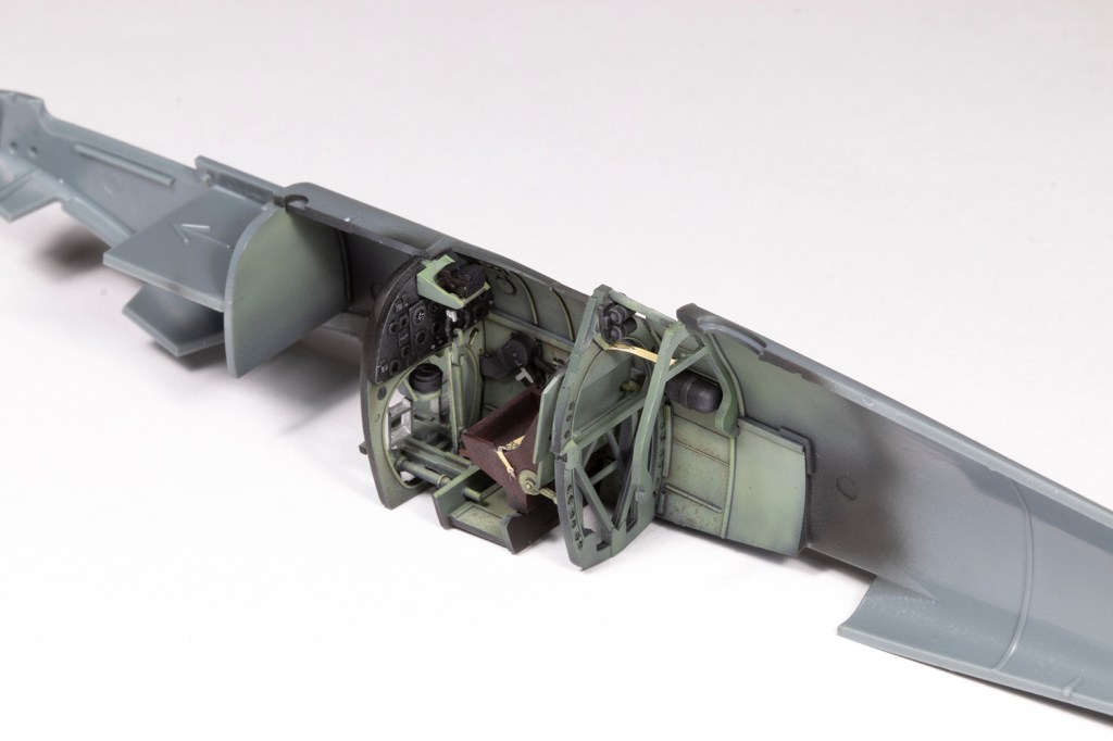 I wanted a fairly high contrast finish to this aircraft, and the cockpit was to be no exception. I shaded the instrument panel, for example, by dry brushing increasingly light grey oil paints over a solid black base. In the past I’ve always struggled with this because the oils never really dry and get removed by subsequent layers. I have learned to overcoat the oils with airbrushed clear (in my case MRP-127 Super Clear Matt). This ‘sets’ the oils in place, and more effects can be added over the top in seconds.