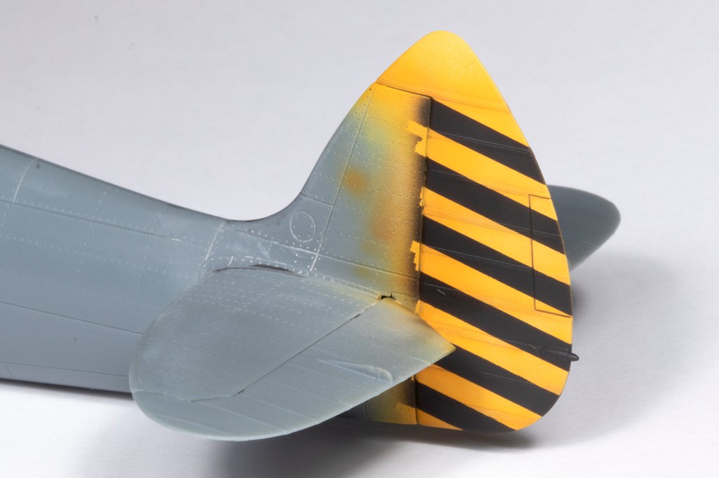 I wanted to paint the rudder fairly early on, before the wings were added, as it would be easier to access and straightforward to mask off. I scanned the fündekals decal sheet and made vinyl masks for the black stripes. The vinyl was much too stiff to go over the detail, but the plan was to use these masks to get the correct spacing so the actual masking could be done with Mr Hobby die cut 1mm strips of masking tape. I like using this as the edge is very sharp. The yellow was MRP RAF Marking Yellow applied over a pink undercoat. This was the first time I tried this and it gave a lovely deep finish. The yellow is probably rather too deep, but I like it. It was shaded by adding white, for highlights, and some red for shadows. Further shading was achieved with ABT Faded Dark Yellow oil paint (which is basically orange), frequently overcoated with MRP Super Clear Matt to ‘fix’ the oils.
