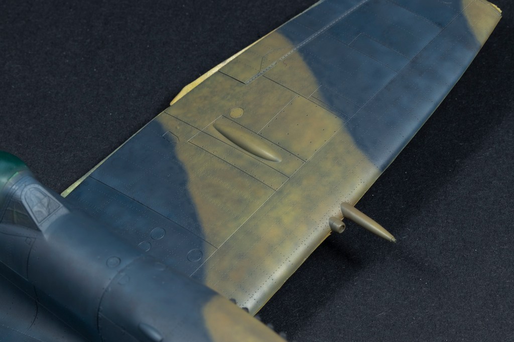 With that done on the lower wings, I could start camouflaging the upper surfaces. The pattern is nice and simple and freehanded with an airbrush as I hate masking. As stated, I wanted a higher contrast finish than I usually attain and thus experimented with layering quite different shades of blue and brown over the black primer, spraying very fine to get a lot of patchiness and sometimes using various mottle masks I’ve acquired. The core of the brown shade was Hataka C257 Uniform Brown FS30145 with much lighter patches in Hataka C259 Yello Ochre FS33434 and some different tones in Mr Color 22 Dark Earth. These lacquer paints were heavily thinned with Mr Levelling Thinners so I could build the opacity up slowly.