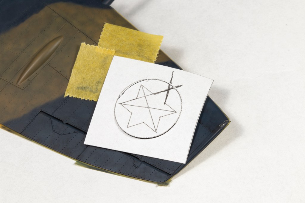 Before moving to the upper camouflage I wanted to paint the Star of David insignia on the lower wings so I would only have to mask once. In the end I elected to make masks for the vast majority of the markings and the only decal used was the squadron insignia, which makes the decal sheet a fairly expensive purchase! I couldn’t find a decent paint recommendation for the Star of David blue (IsraDecal simply say ‘Dark Blue’ for their masks) and thus embarked on spraying all the blues I had in stock. My conclusion was that Mr Color 328 FS15050 was an excellent match for the blue printed by fündekals and that was good enough for me. I slightly resized the star on the fuselage sides to give a better match to my interpretation of the photo I had, and also changed the ‘0’ slightly for the same reason.