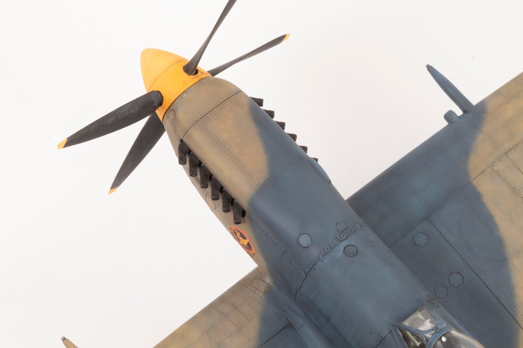 Once I was happy enough with this patchy finish, the remaining markings were airbrushed in Tamiya XF-2 White and Mr Color 328 and the squadron insignia decal applied.