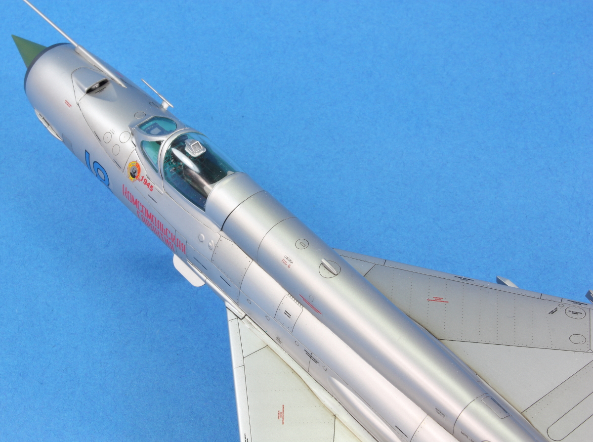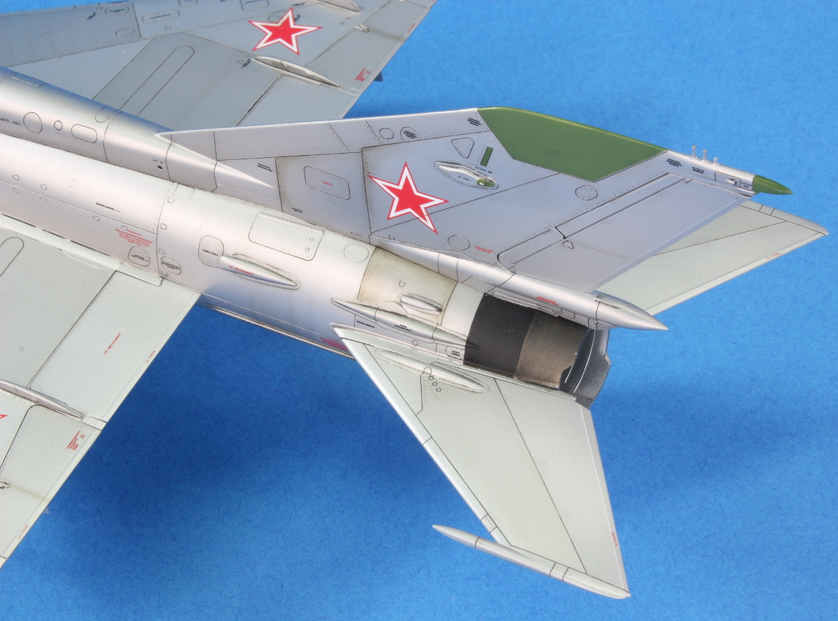Masking. Oh my word. I must have spent 20+ hours masking the regular silver to add a darkened tone (an inexact mix of Mr Color 8 Silver and 28 Steel, which I varied for each airframe). The panel to panel variation is very predictable on NMF MiG-21s and becomes immediately obvious when you start looking at photos. Unfortunately, none of the panels are simple. Everything is either curved, or a complex geometry or protruding. It’s a masking nightmare, and I’ve now done it four times. Never again! The effect though is, in my opinion, rather impressive once done.