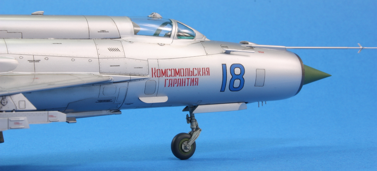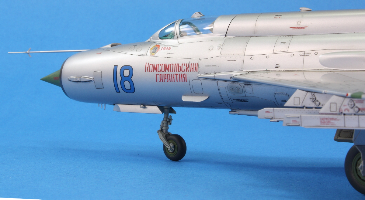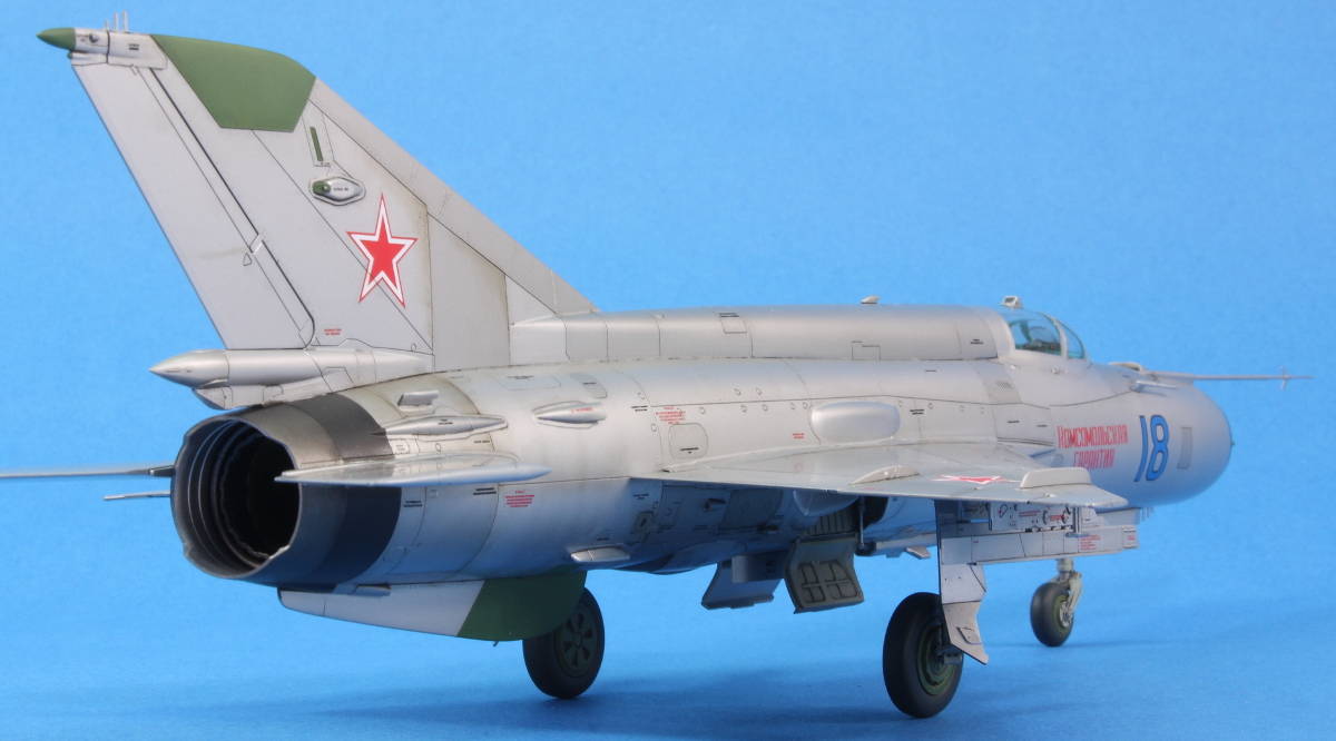 The decals for this aircraft were cobbled together from various sources. Having already purchased two sets of Begemot stencils, I couldn’t stomach the cost of buying more, and used the Eduard stencilling. This is well printed, but Eduard have made some weird cock-up with the Russian stencils; if you look carefully you’ll see the images have been printed on top of one another and are much less clear than the Czech stencils. In fact, Eduard don’t draw your attention to the fact that for each stencil (well, most of them) there is a Russian and a Czech version, yet they share the same decal number. Make sure you use the correct ones! The main markings are from the Begemot MiG-21 set. I have made three options from this sheet but they only give you enough stars for one. In this instance, since the stars in the kit lack the outer red border, I had to use some from a CAM decals MiG-29 sheet that had them in the correct size. All of these decals worked very well over a generous puddle of Mr Setter. I am confused over the colour of the ’18’. On Begemot’s website there’s a scan of the decal sheet and it’s a red ’18’; on the one I received and used, it’s blue. Who knows what the correct colour is? I also have doubts that this marking scheme is from 1974 since that’s when the same unit was using the MiG-21bis, but if anyone can confirm the date, I’d be most grateful.