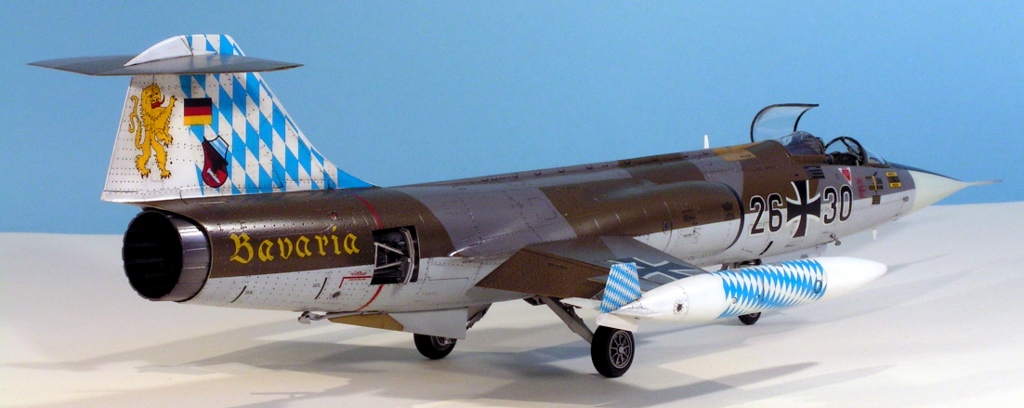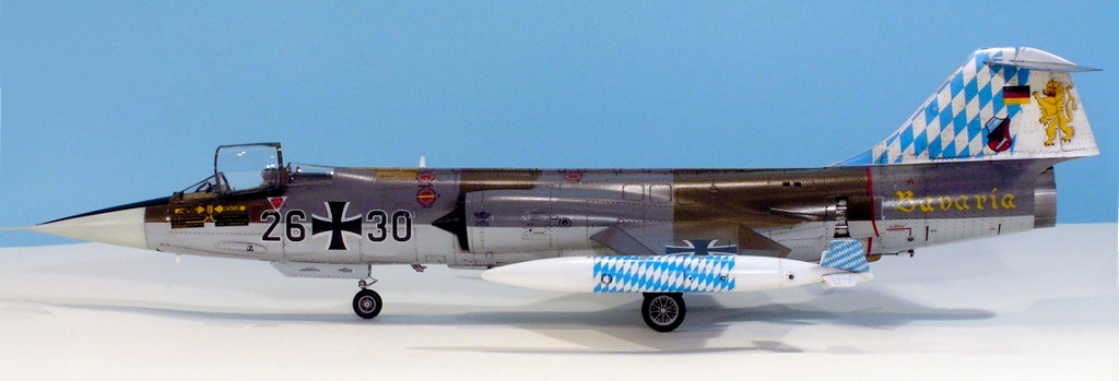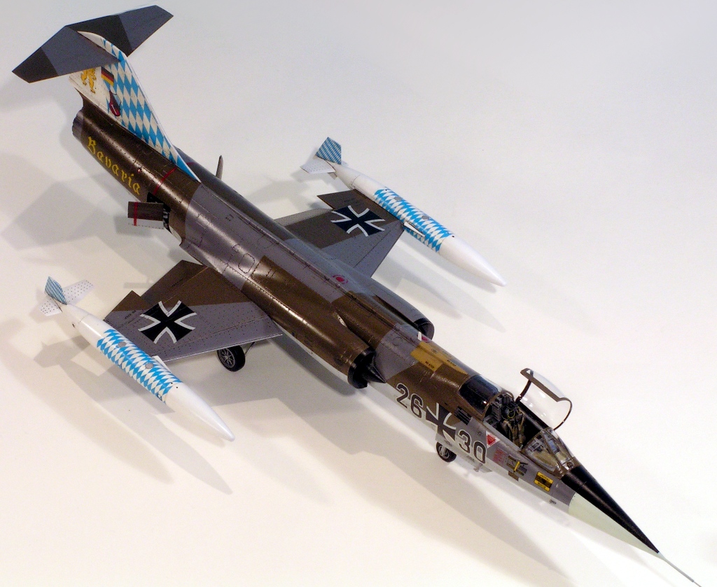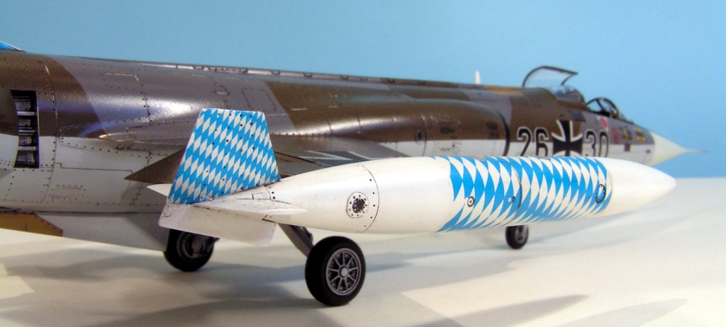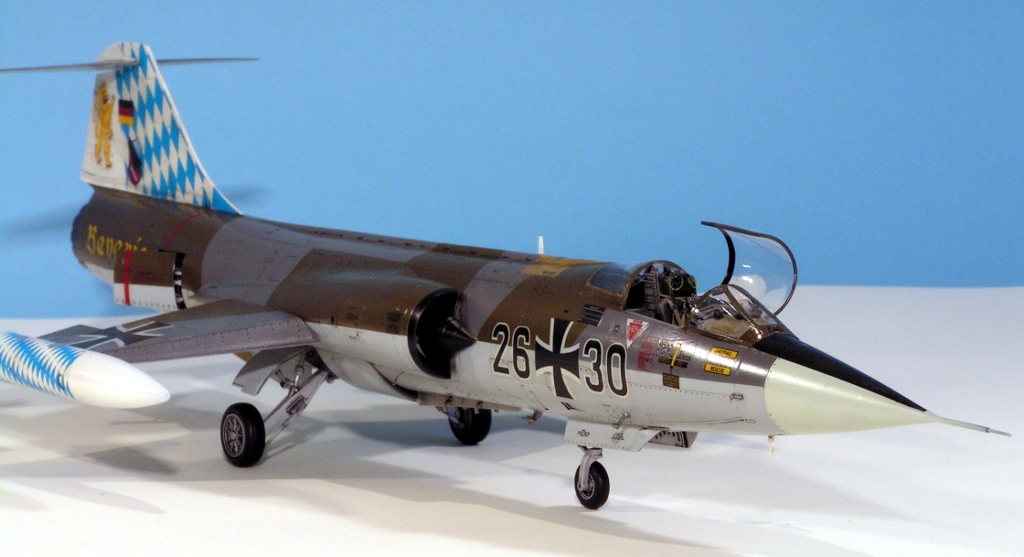 Built alongside my USAF F-104C is this German F-104G Starfighter. The same comments apply for both models, but I added a resin cockpit set from Aires. This also contains photo-etch for the instrument panel and seat harness. The resin set fits well if one is patient with removing the excess resin and plastic around the cockpit area. I removed too much plastic around the instrument coaming and had to tidy that up. The detail in the resin set is very good and I recommend it. I also replaced the nose pitot with brass tube and wire. The finish is mostly Xtracolour enamels, as they were the only manufacturer I could find who did the correct colours, but the white trim is Humbrol. The kit decals were great. I used Pollyscale Satin varnish because I found the flat varnish to be a little too flat. Now I think the satin is a little too gloss, so I’ve since experimented with mixing the two. I also added a couple of spare etched blade antennae which photos of this aircraft show were present.