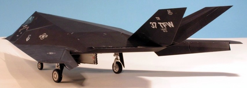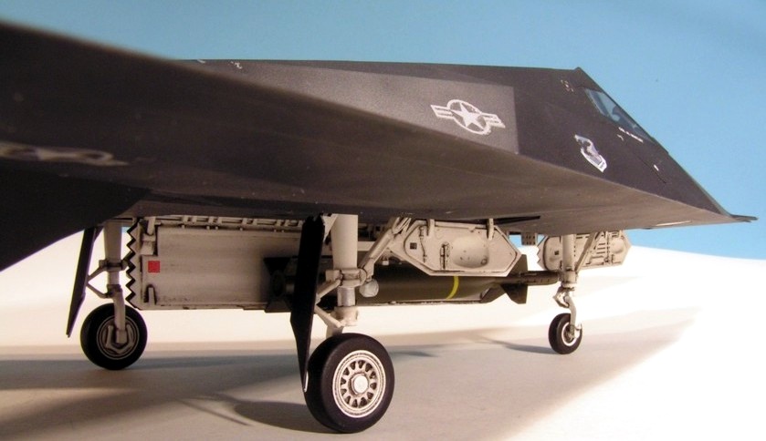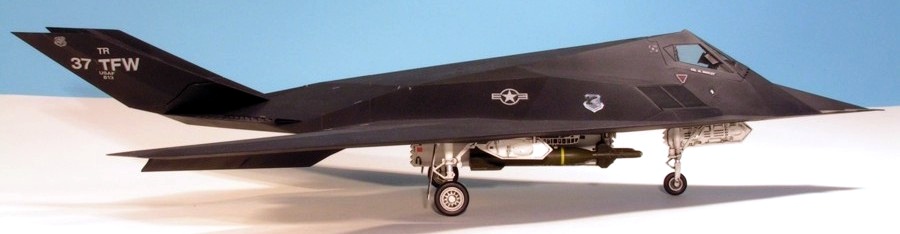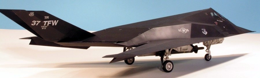 The fourth Lockheed ‘black bird’ to appear on these pages is Tamiya’s F-117A Nighthawk, otherwise known as the ‘stealth fighter’. As with all Tamiya kits from the past 10 years or so, this is an exceptional model. The upper and lower fuselages are each moulded as a single piece with the wings. The flaps and tails are positionable and there is a well-detailed bomb bay included with the laser-guided bombs unique to the F-117. I built this kit out-of-the-box, but, as if often the case with really nice kits, I got lazy and should have spent more time cleaning up the seam between the two fuselage halves. Fortunately it’s on the underside, so it’s hidden. In addition, the real Nighthawk has no visible panel lines, but I couldn’t be bothered to fill all the lovely engraved detail on the kit. Unfortunately, one of the instrument coaming panels has come loose inside the cockpit. The finish is Humbrol enamel, and the windows were masked with the masks that come in the kit. I used Johnson’s Klear as a base for the decals, and for the first time got hold of some Microsetsetting agent. This didn’t seem to make any difference to the decals and they silvered a bit. This is a surprisingly big model, about the size of a Phantom II.